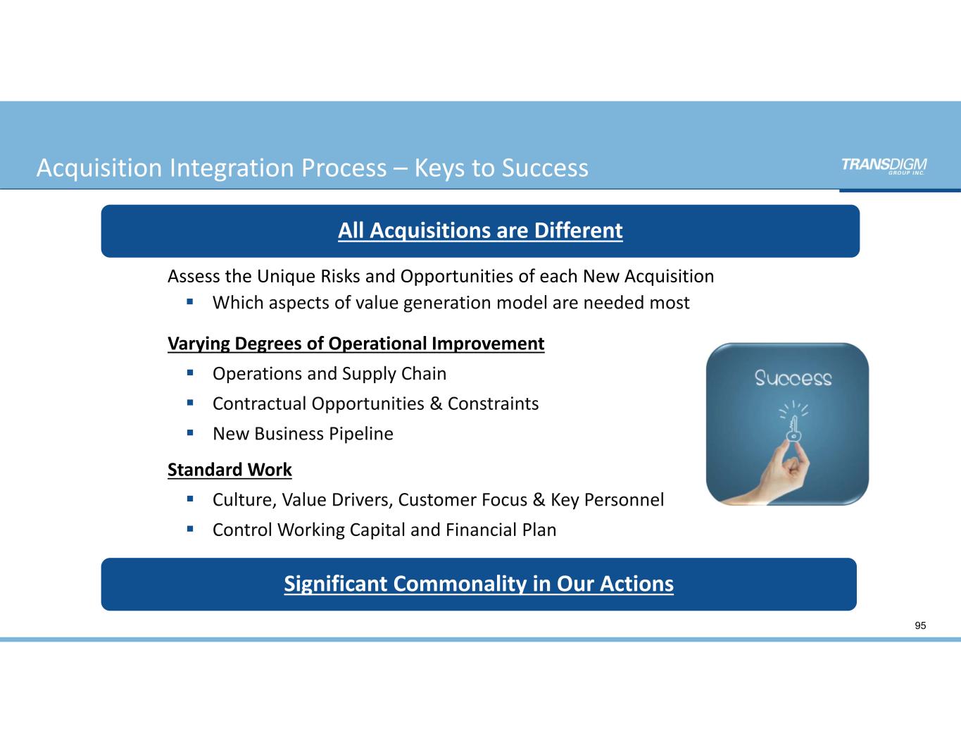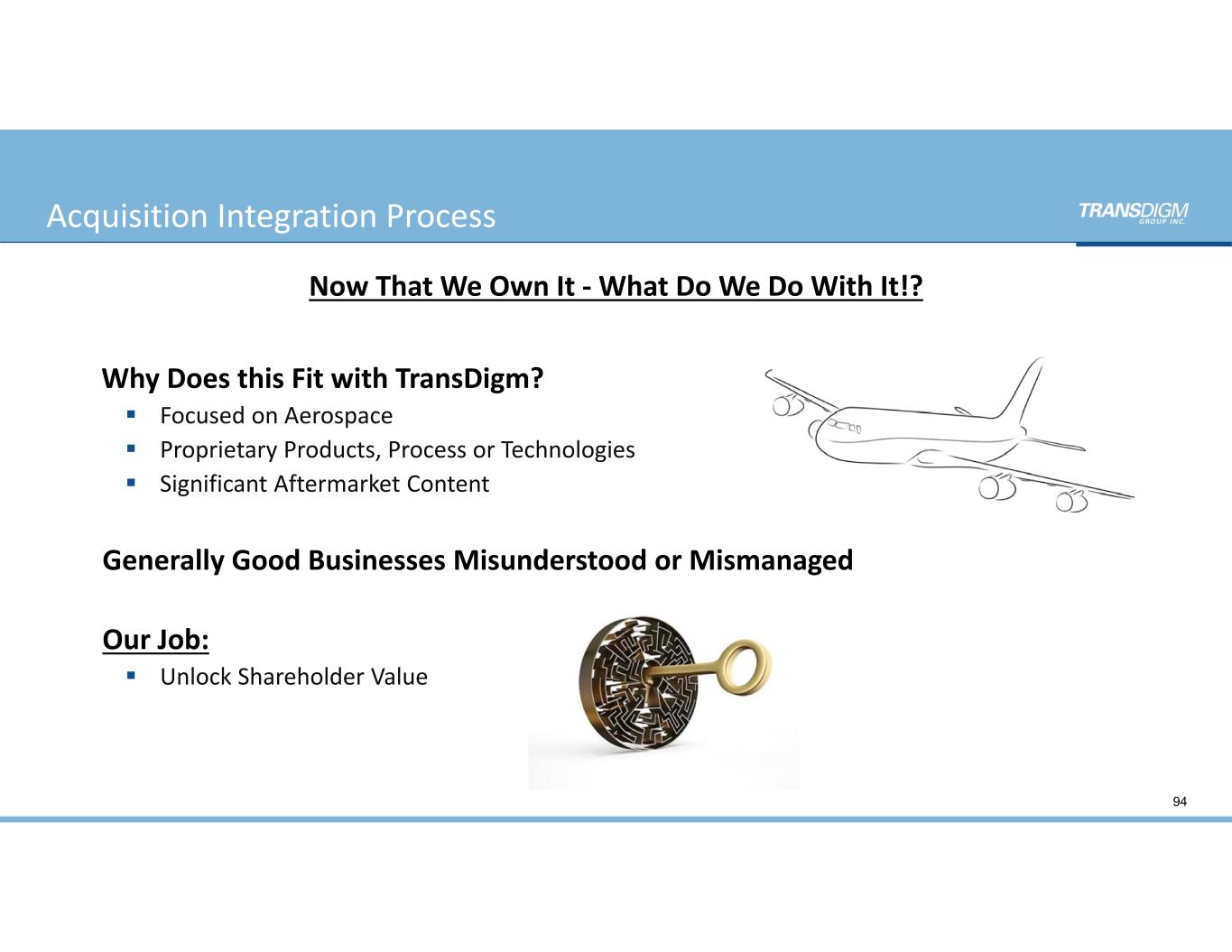 Acquisition Integration Process Now That We Own It ‐ What Do We Do With It!? Why Does this Fit with TransDigm?  Focused on Aerospace  Proprietary Products, Process or Technologies  Significant Aftermarket Content Generally Good Businesses Misunderstood or Mismanaged Our Job:  Unlock Shareholder Value 94