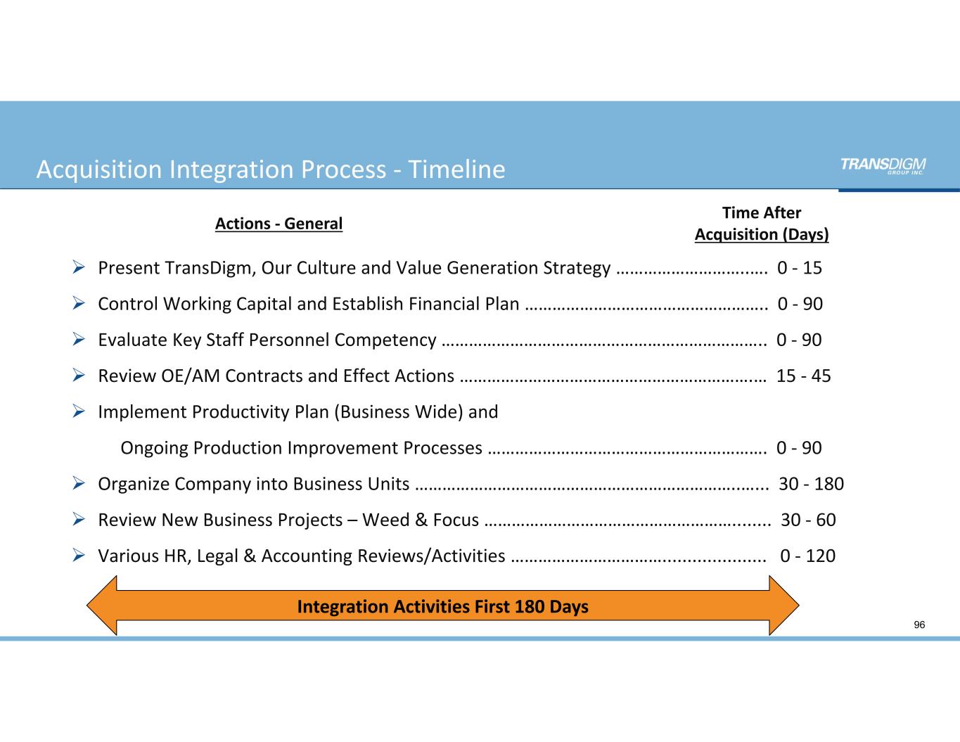 Acquisition Integration Process ‐ Timeline  Present TransDigm, Our Culture and Value Generation Strategy ………………………..….  0 ‐ 15  Control Working Capital and Establish Financial Plan ……………………………………………..  0 ‐ 90  Evaluate Key Staff Personnel Competency ……………………………………………………………..  0 ‐ 90  Review OE/AM Contracts and Effect Actions ……………………………………………………….…  15 ‐ 45  Implement Productivity Plan (Business Wide) and  Ongoing Production Improvement Processes …………………………………………………….  0 ‐ 90  Organize Company into Business Units ……………………………………………………………..…...  30 ‐ 180  Review New Business Projects – Weed & Focus ………………………………………………........  30 ‐ 60  Various HR, Legal & Accounting Reviews/Activities …………………………….....................   0 ‐ 120 96 Actions ‐ General Time After  Acquisition (Days) Integration Activities First 180 Days