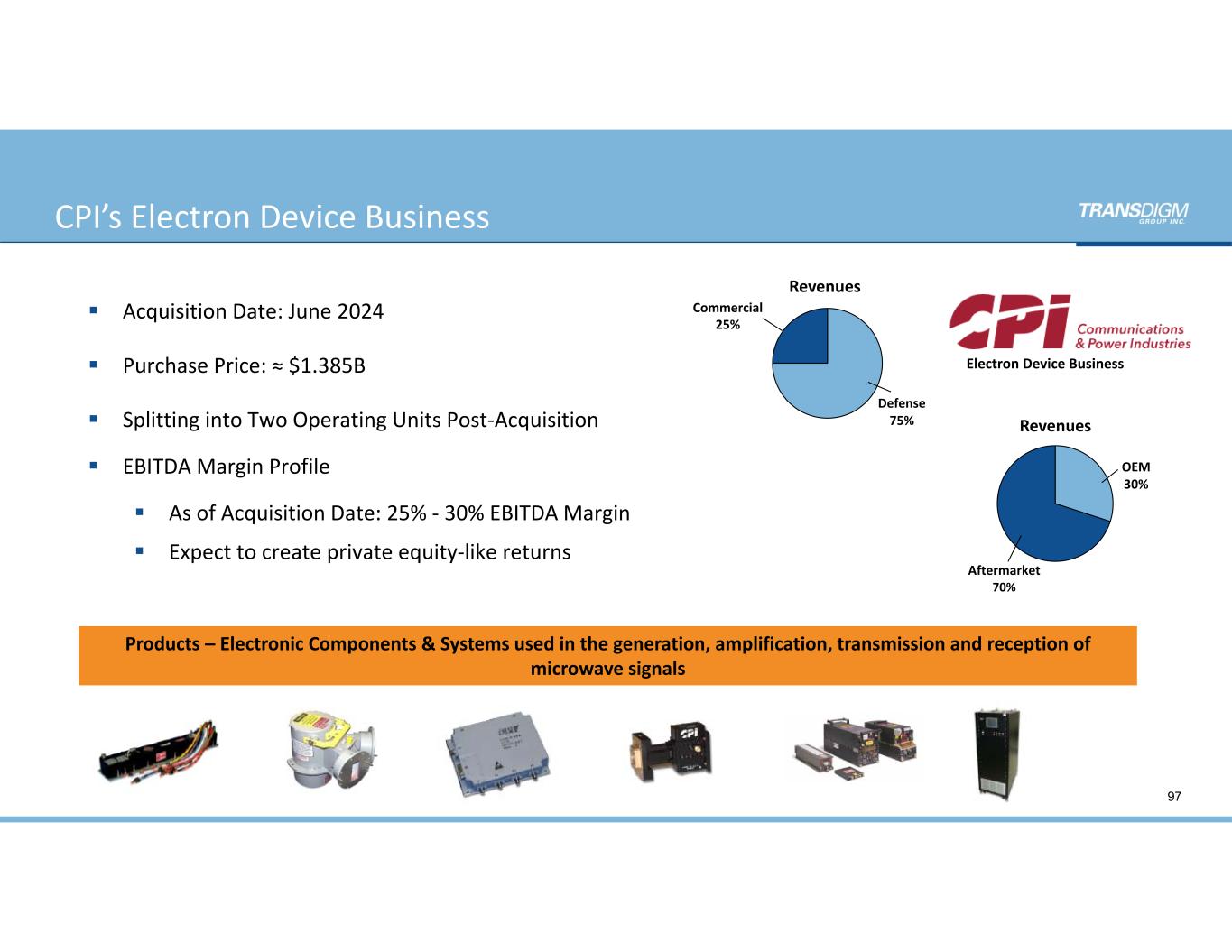 CPI’s Electron Device Business 97  Acquisition Date: June 2024  Purchase Price: ≈ $1.385B  Splitting into Two Operating Units Post‐Acquisition   EBITDA Margin Profile  As of Acquisition Date: 25% ‐ 30% EBITDA Margin   Expect to create private equity‐like returns Products – Electronic Components & Systems used in the generation, amplification, transmission and reception of  microwave signals Defense 75% OEM 30% Aftermarket 70% Revenues Revenues Commercial 25% Electron Device Business