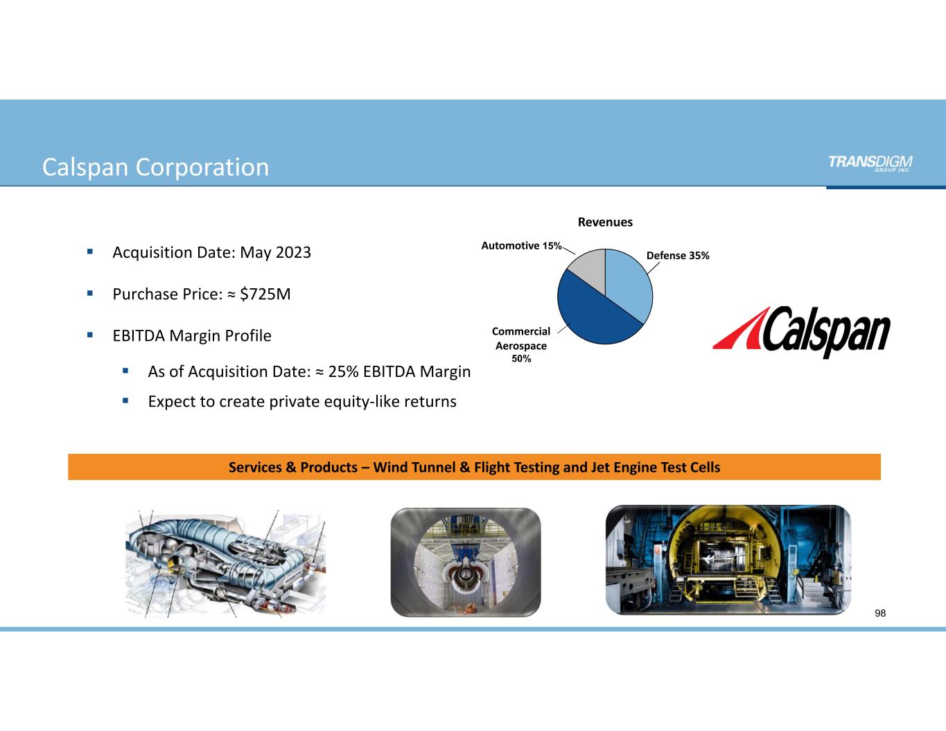 Calspan Corporation 98  Acquisition Date: May 2023  Purchase Price: ≈ $725M  EBITDA Margin Profile  As of Acquisition Date: ≈ 25% EBITDA Margin   Expect to create private equity‐like returns Services & Products – Wind Tunnel & Flight Testing and Jet Engine Test Cells Defense 35% Commercial  Aerospace 50% Automotive 15% Revenues
