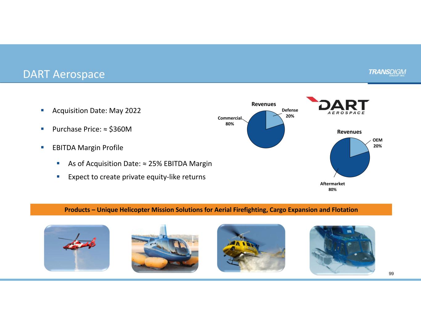 DART Aerospace 99  Acquisition Date: May 2022  Purchase Price: ≈ $360M  EBITDA Margin Profile  As of Acquisition Date: ≈ 25% EBITDA Margin   Expect to create private equity‐like returns Products – Unique Helicopter Mission Solutions for Aerial Firefighting, Cargo Expansion and Flotation   Defense 20% OEM 20% Aftermarket 80% Revenues Revenues Commercial 80%