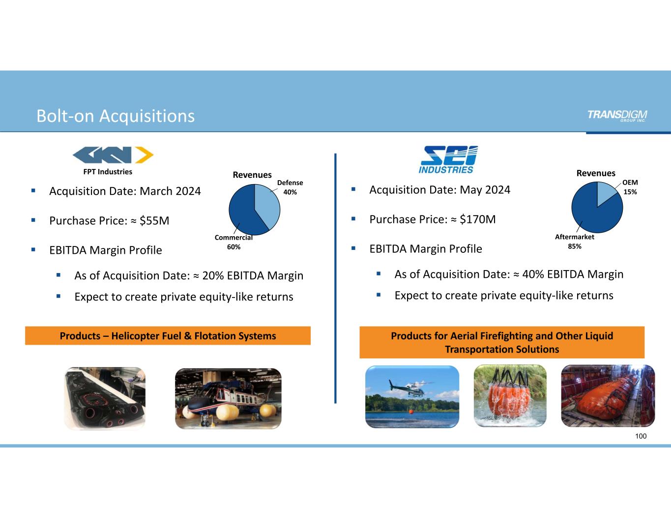 Bolt‐on Acquisitions 100  Acquisition Date: March 2024  Purchase Price: ≈ $55M  EBITDA Margin Profile  As of Acquisition Date: ≈ 20% EBITDA Margin   Expect to create private equity‐like returns Products – Helicopter Fuel & Flotation Systems Defense 40% Commercial 60% Revenues Products for Aerial Firefighting and Other Liquid  Transportation Solutions    Acquisition Date: May 2024  Purchase Price: ≈ $170M  EBITDA Margin Profile  As of Acquisition Date: ≈ 40% EBITDA Margin   Expect to create private equity‐like returns OEM 15% Aftermarket 85% RevenuesFPT Industries