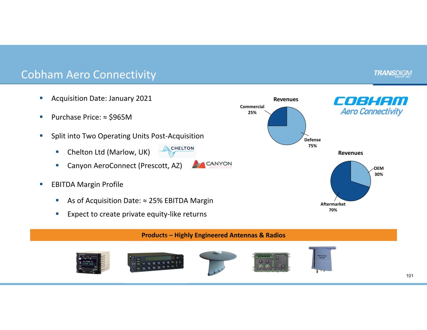 Cobham Aero Connectivity 101  Acquisition Date: January 2021  Purchase Price: ≈ $965M  Split into Two Operating Units Post‐Acquisition   Chelton Ltd (Marlow, UK)  Canyon AeroConnect (Prescott, AZ)  EBITDA Margin Profile  As of Acquisition Date: ≈ 25% EBITDA Margin   Expect to create private equity‐like returns Products – Highly Engineered Antennas & Radios  Defense 75% OEM 30% Aftermarket 70% Revenues Revenues Commercial 25% Aero Connectivity