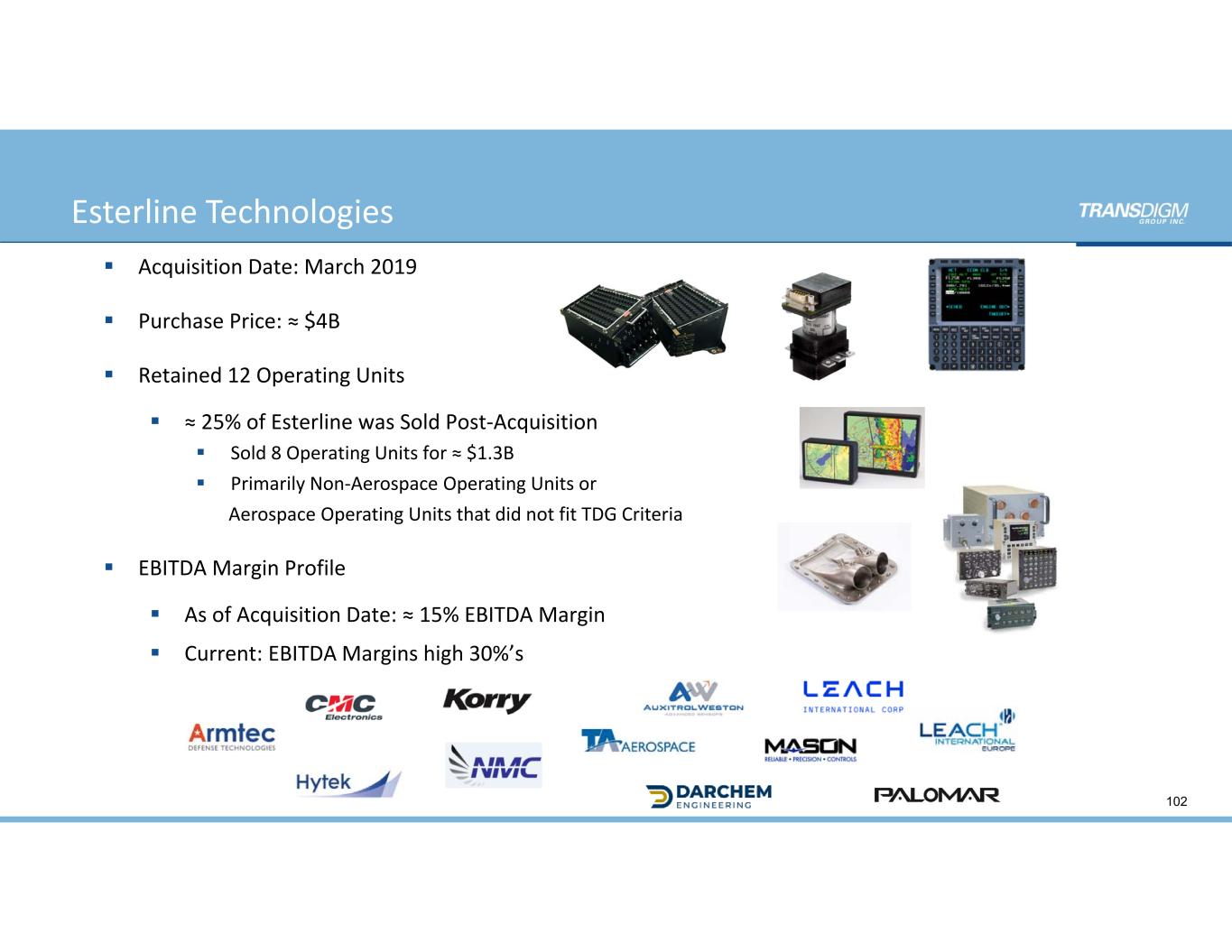 Esterline Technologies 102  Acquisition Date: March 2019  Purchase Price: ≈ $4B  Retained 12 Operating Units   ≈ 25% of Esterline was Sold Post‐Acquisition  Sold 8 Operating Units for ≈ $1.3B  Primarily Non‐Aerospace Operating Units or  Aerospace Operating Units that did not fit TDG Criteria  EBITDA Margin Profile  As of Acquisition Date: ≈ 15% EBITDA Margin   Current: EBITDA Margins high 30%’s