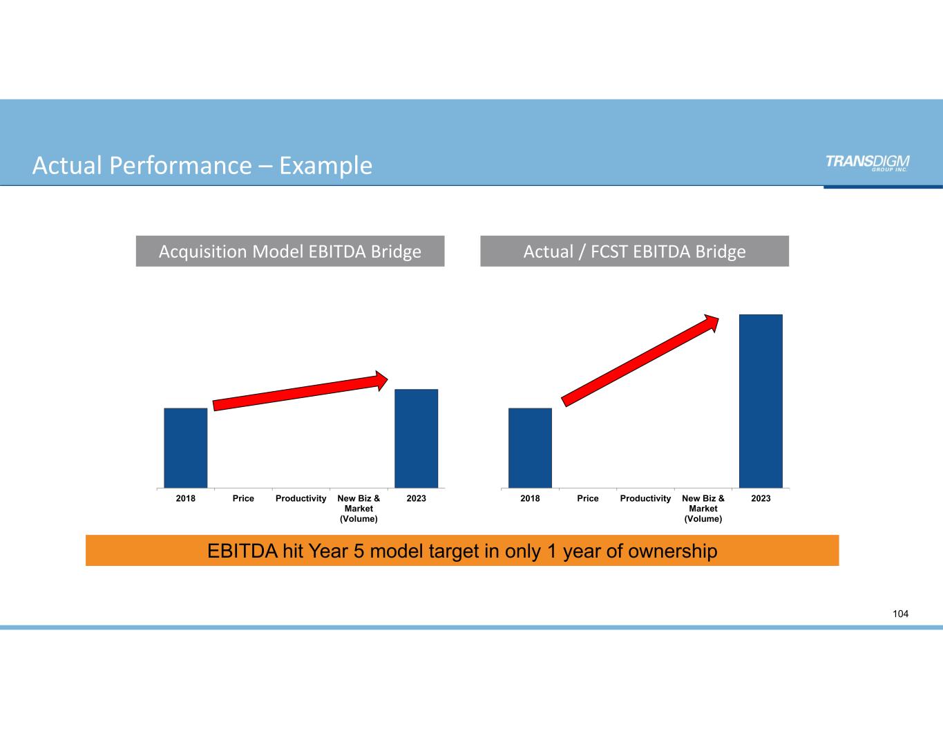 Actual Performance – Example 2018 Price Productivity New Biz & Market (Volume) 2023 2018 Price Productivity New Biz & Market (Volume) 2023 EBITDA hit Year 5 model target in only 1 year of ownership Acquisition Model EBITDA Bridge Actual / FCST EBITDA Bridge 104