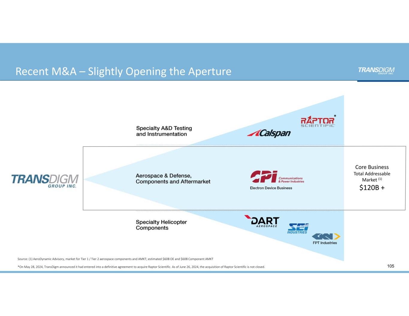 Recent M&A – Slightly Opening the Aperture 105 CORE BUSINESS Aerospace & Defense, Components and Aftermarket Source: (1) AeroDynamic Advisory, market for Tier 1 / Tier 2 aerospace components and AMKT; estimated $60B OE and $60B Component AMKT * *On May 28, 2024, TransDigm announced it had entered into a definitive agreement to acquire Raptor Scientific. As of June 26, 2024, the acquisition of Raptor Scientific is not closed.  Core Business Total Addressable  Market (1) $120B +