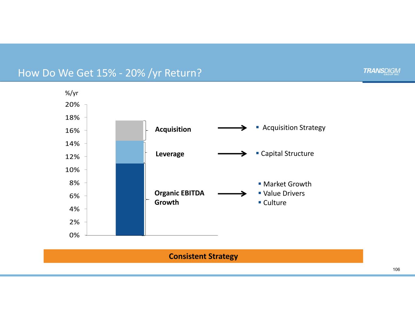 106 How Do We Get 15% ‐ 20% /yr Return? 0% 2% 4% 6% 8% 10% 12% 14% 16% 18% 20% Acquisition Leverage Organic EBITDA  Growth  Acquisition Strategy  Capital Structure Market Growth   Value Drivers   Culture %/yr Consistent Strategy