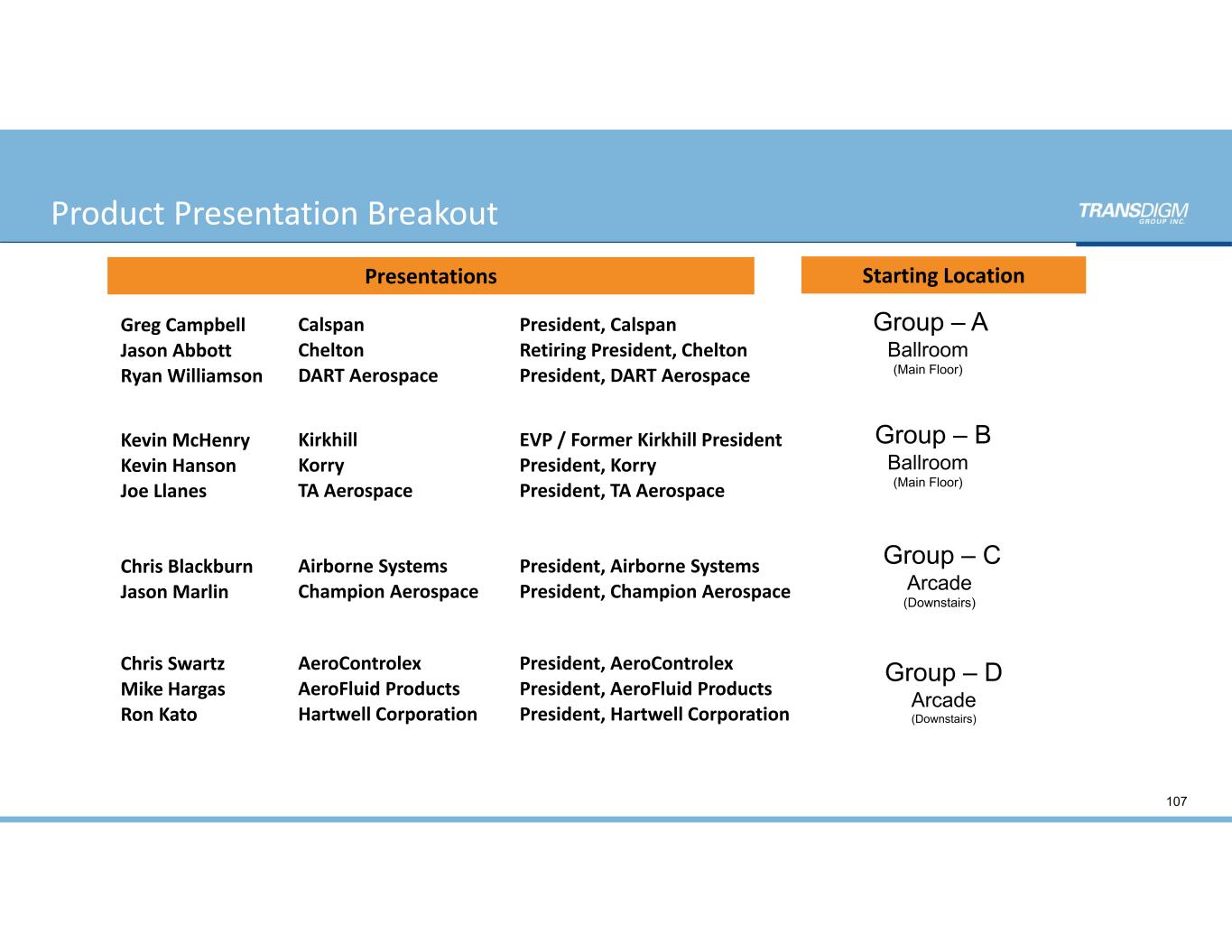 107 Presentations Starting Location Product Presentation Breakout Group – A Ballroom (Main Floor) Group – C Arcade (Downstairs) Group – D Arcade (Downstairs) Group – B Ballroom (Main Floor) Greg Campbell Calspan President, Calspan Jason Abbott Chelton Retiring President, Chelton Ryan Williamson DART Aerospace President, DART Aerospace Kevin McHenry Kirkhill EVP / Former Kirkhill President Kevin Hanson Korry President, Korry Joe Llanes TA Aerospace President, TA Aerospace Chris Blackburn Airborne Systems President, Airborne Systems Jason Marlin Champion Aerospace President, Champion Aerospace Chris Swartz AeroControlex President, AeroControlex Mike Hargas AeroFluid Products President, AeroFluid Products Ron Kato Hartwell Corporation President, Hartwell Corporation