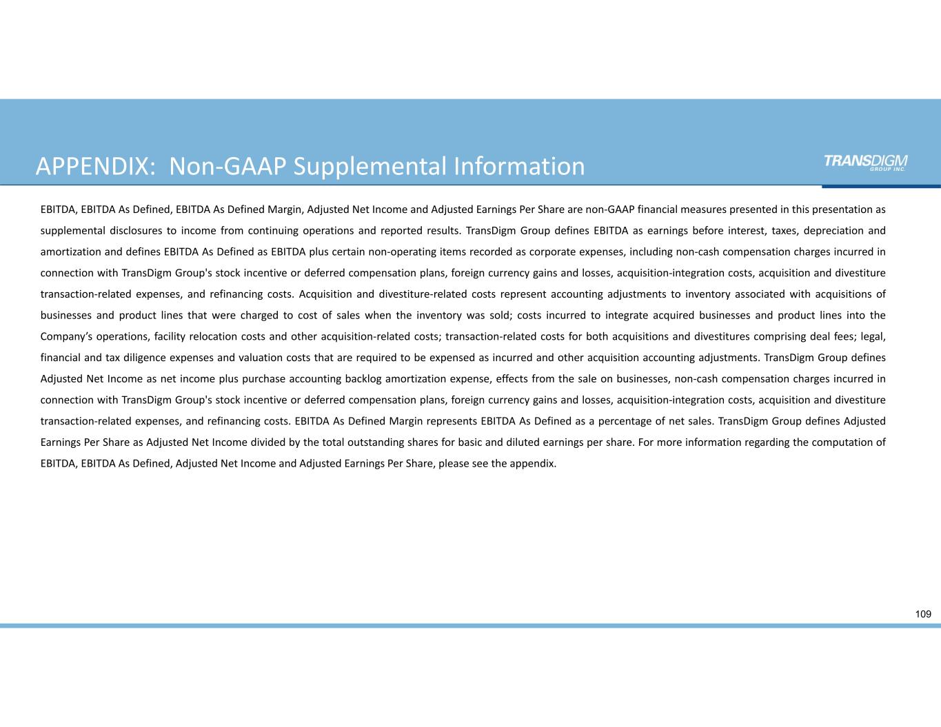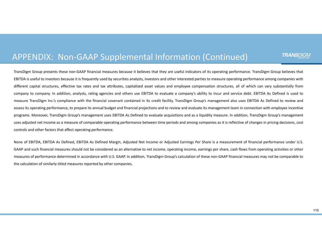APPENDIX:  Non‐GAAP Supplemental Information 109 EBITDA, EBITDA As Defined, EBITDA As Defined Margin, Adjusted Net Income and Adjusted Earnings Per Share are non‐GAAP financial measures presented in this presentation as supplemental disclosures to income from continuing operations and reported results. TransDigm Group defines EBITDA as earnings before interest, taxes, depreciation and amortization and defines EBITDA As Defined as EBITDA plus certain non‐operating items recorded as corporate expenses, including non‐cash compensation charges incurred in connection with TransDigm Group's stock incentive or deferred compensation plans, foreign currency gains and losses, acquisition‐integration costs, acquisition and divestiture transaction‐related expenses, and refinancing costs. Acquisition and divestiture‐related costs represent accounting adjustments to inventory associated with acquisitions of businesses and product lines that were charged to cost of sales when the inventory was sold; costs incurred to integrate acquired businesses and product lines into the Company’s operations, facility relocation costs and other acquisition‐related costs; transaction‐related costs for both acquisitions and divestitures comprising deal fees; legal, financial and tax diligence expenses and valuation costs that are required to be expensed as incurred and other acquisition accounting adjustments. TransDigm Group defines Adjusted Net Income as net income plus purchase accounting backlog amortization expense, effects from the sale on businesses, non‐cash compensation charges incurred in connection with TransDigm Group's stock incentive or deferred compensation plans, foreign currency gains and losses, acquisition‐integration costs, acquisition and divestiture transaction‐related expenses, and refinancing costs. EBITDA As Defined Margin represents EBITDA As Defined as a percentage of net sales. TransDigm Group defines Adjusted Earnings Per Share as Adjusted Net Income divided by the total outstanding shares for basic and diluted earnings per share. For more information regarding the computation of EBITDA, EBITDA As Defined, Adjusted Net Income and Adjusted Earnings Per Share, please see the appendix.