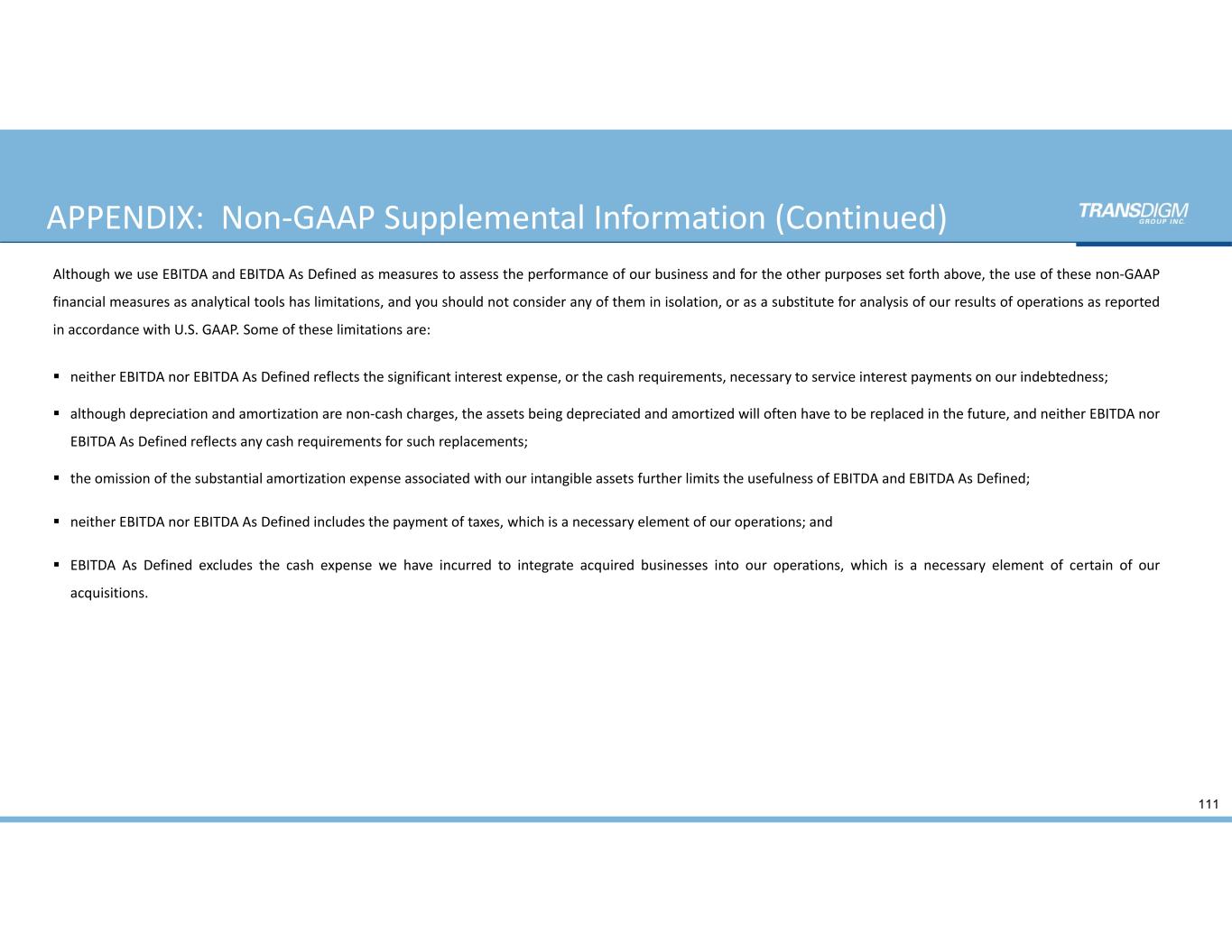 APPENDIX:  Non‐GAAP Supplemental Information (Continued) 110 TransDigm Group presents these non‐GAAP financial measures because it believes that they are useful indicators of its operating performance. TransDigm Group believes that EBITDA is useful to investors because it is frequently used by securities analysts, investors and other interested parties to measure operating performance among companies with different capital structures, effective tax rates and tax attributes, capitalized asset values and employee compensation structures, all of which can vary substantially from company to company. In addition, analysts, rating agencies and others use EBITDA to evaluate a company’s ability to incur and service debt. EBITDA As Defined is used to measure TransDigm Inc.’s compliance with the financial covenant contained in its credit facility. TransDigm Group’s management also uses EBITDA As Defined to review and assess its operating performance, to prepare its annual budget and financial projections and to review and evaluate its management team in connection with employee incentive programs. Moreover, TransDigm Group’s management uses EBITDA As Defined to evaluate acquisitions and as a liquidity measure. In addition, TransDigm Group’s management uses adjusted net income as a measure of comparable operating performance between time periods and among companies as it is reflective of changes in pricing decisions, cost controls and other factors that affect operating performance. None of EBITDA, EBITDA As Defined, EBITDA As Defined Margin, Adjusted Net Income or Adjusted Earnings Per Share is a measurement of financial performance under U.S. GAAP and such financial measures should not be considered as an alternative to net income, operating income, earnings per share, cash flows from operating activities or other measures of performance determined in accordance with U.S. GAAP. In addition, TransDigm Group’s calculation of these non‐GAAP financial measures may not be comparable to the calculation of similarly titled measures reported by other companies.
