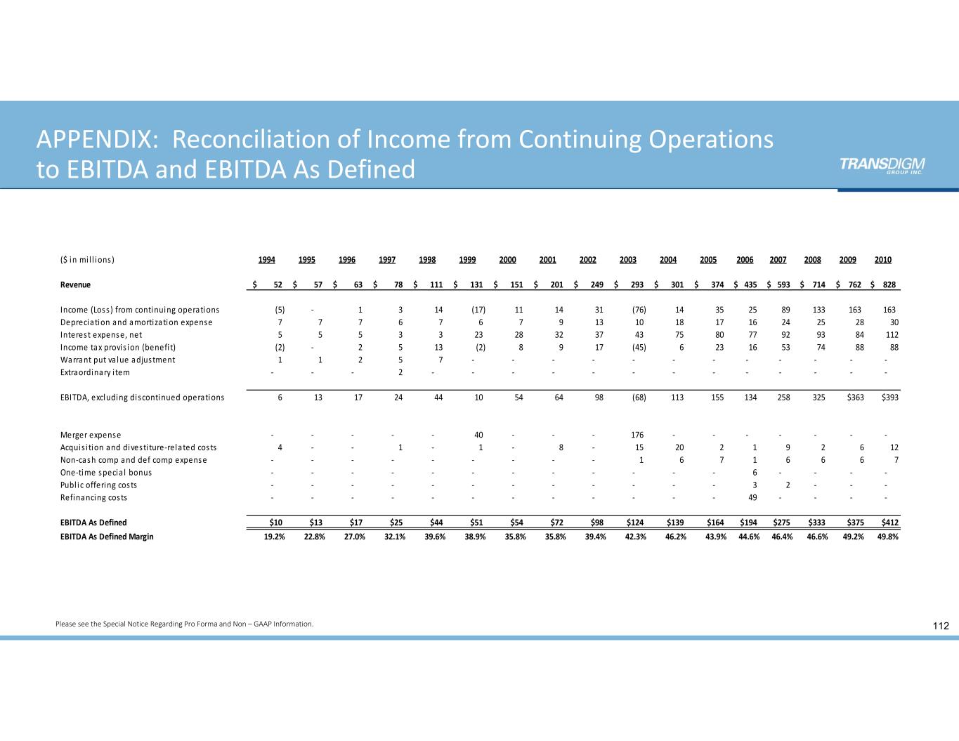 APPENDIX:  Reconciliation of Income from Continuing Operations  to EBITDA and EBITDA As Defined 112 ($ in mi l l ions) 1994 1995 1996 1997 1998 1999 2000 2001 2002 2003 2004 2005 2006 2007 2008 2009 2010 Revenue 52$          57$          63$          78$          111$        131$        151$        201$        249$        293$        301$        374$        435$     593$     714$      762$      828$      Income (Loss ) from continuing operations (5)             ‐           1              3              14            (17)           11            14            31            (76)           14            35            25         89         133        163        163        Depreciation and amortization expense 7              7              7              6              7              6              7              9              13            10            18            17            16         24         25          28 30 Interest expense, net 5              5              5              3              3              23            28            32            37            43            75            80            77         92         93          84 112 Income tax provis ion (benefi t) (2)             ‐           2              5              13            (2)             8              9              17            (45)           6              23            16         53         74          88 88 Warrant put va lue adjustment 1              1              2              5              7              ‐           ‐           ‐           ‐           ‐           ‐           ‐           ‐        ‐        ‐         ‐         ‐        Extraordinary i tem ‐           ‐           ‐           2              ‐           ‐           ‐           ‐           ‐           ‐           ‐           ‐           ‐        ‐        ‐         ‐         ‐        EBITDA, excluding discontinued operations 6              13            17            24            44            10            54            64            98            (68)           113          155          134       258       325        $363 $393 Merger expense ‐           ‐           ‐           ‐           ‐           40            ‐           ‐           ‐           176          ‐           ‐           ‐        ‐        ‐         ‐         ‐        Acquis i tion and divesti ture‐related costs 4              ‐           ‐           1              ‐           1              ‐           8              ‐           15            20            2              1           9           2            6 12 Non‐cash comp and def comp expense ‐           ‐          ‐         ‐         ‐         ‐         ‐         ‐         ‐           1            6            7            1         6         6          6 7 One‐time specia l  bonus ‐           ‐          ‐         ‐         ‐         ‐         ‐         ‐         ‐           ‐         ‐         ‐         6         ‐      ‐       ‐       ‐      Publ ic offering cos ts ‐           ‐          ‐         ‐         ‐         ‐         ‐         ‐         ‐           ‐         ‐         ‐         3         2         ‐       ‐       ‐      Refinancing costs ‐           ‐           ‐           ‐           ‐           ‐           ‐           ‐           ‐           ‐           ‐           ‐           49         ‐        ‐         ‐         ‐        EBITDA As Defined $10 $13 $17 $25 $44 $51 $54 $72 $98 $124 $139 $164 $194 $275 $333 $375 $412 EBITDA As Defined Margin 19.2% 22.8% 27.0% 32.1% 39.6% 38.9% 35.8% 35.8% 39.4% 42.3% 46.2% 43.9% 44.6% 46.