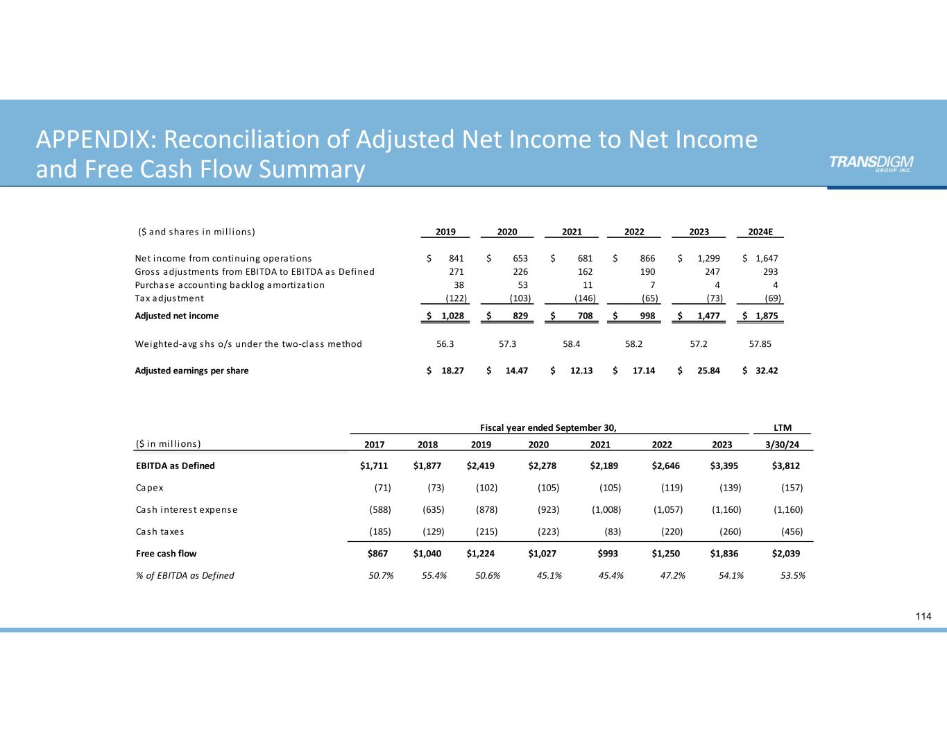 APPENDIX: Reconciliation of Adjusted Net Income to Net Income  and Free Cash Flow Summary 114 ($ and shares  in mi l l ions) 2019 2020 2021 2022 2023 2024E Net income from continuing operations 841$         653$          681$           866$           1,299$        1,647$     Gross  adjustments  from EBITDA to EBITDA as  Defined 271           226            162             190             247             293          Purchase accounting backlog amorti zation 38             53              11               7                 4                 4              Tax adjus tment (122)         (103)           (146)           (65)             (73)             (69)           Adjusted net income 1,028$      829$          708$           998$           1,477$        1,875$     Weighted‐avg shs  o/s  under the two‐class  method 56.3 57.3 58.4 58.2 57.2 57.85 Adjusted earnings per share 18.27$      14.47$       12.13$        17.14$        25.84$        32.42$     Fiscal year ended September 30,  LTM ($ in mi l l ions ) 2017 2018 2019 2020 2021 2022 2023 3/30/24 EBITDA as Defined $1,711 $1,877 $2,419 $2,278 $2,189 $2,646 $3,395 $3,812 Capex (71) (73) (102) (105) (105) (119) (139) (157) Cash interest expense (588) (635) (878) (923) (1,008) (1,057) (1,160) (1,160) Cash taxes (185) (129) (215) (223) (83) (220) (260) (456) Free cash flow $867 $1,040 $1,224 $1,027 $993 $1,250 $1,836 $2,039 % of EBITDA as Defined 50.7% 55.4% 50.6% 45.1% 45.4% 47.2% 54.1% 53.5%