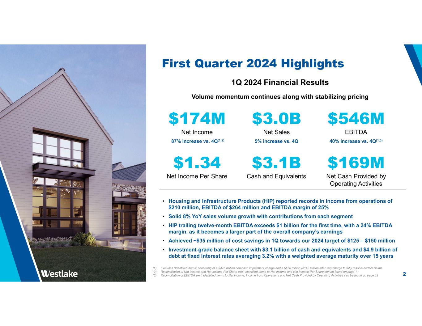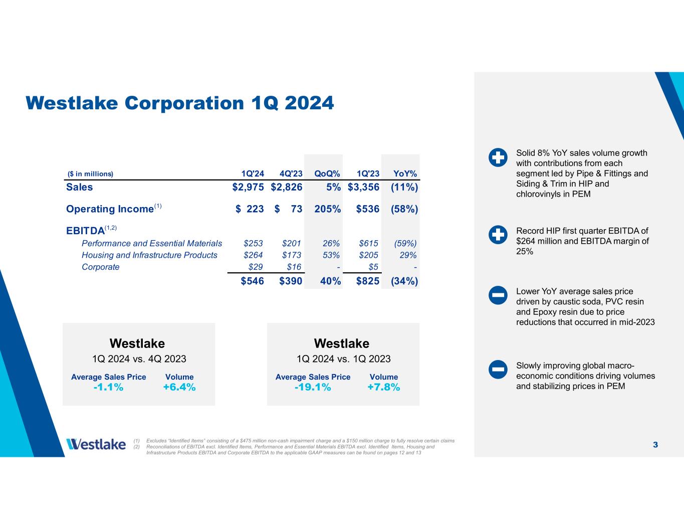 2 First Quarter 2024 Highlights (1) Excludes “Identified Items” consisting of a $475 million non-cash impairment charge and a $150 million ($115 million after tax) charge to fully resolve certain claims (2) Reconciliation of Net Income and Net Income Per Share excl. Identified Items to Net Income and Net Income Per Share can be found on page 11 (3) Reconciliation of EBITDA excl. Identified Items to Net Income, Income from Operations and Net Cash Provided by Operating Activities can be found on page 12 1Q 2024 Financial Results Volume momentum continues along with stabilizing pricing • Housing and Infrastructure Products (HIP) reported records in income from operations of $210 million, EBITDA of $264 million and EBITDA margin of 25% • Solid 8% YoY sales volume growth with contributions from each segment • HIP trailing twelve-month EBITDA exceeds $1 billion for the first time, with a 24% EBITDA margin, as it becomes a larger part of the overall company’s earnings • Achieved ~$35 million of cost savings in 1Q towards our 2024 target of $125 – $150 million • Investment-grade balance sheet with $3.1 billion of cash and equivalents and $4.9 billion of debt at fixed interest rates averaging 3.2% with a weighted average maturity over 15 years $3.0B Net Sales 5% increase vs. 4Q $174M Net Income 87% increase vs. 4Q(1,2) $546M EBITDA 40% increase vs. 4Q(1,3) $1.34 Net Income Per Share $169M Net Cash Provided by Operating Activities $3.1B Cash and Equivalents