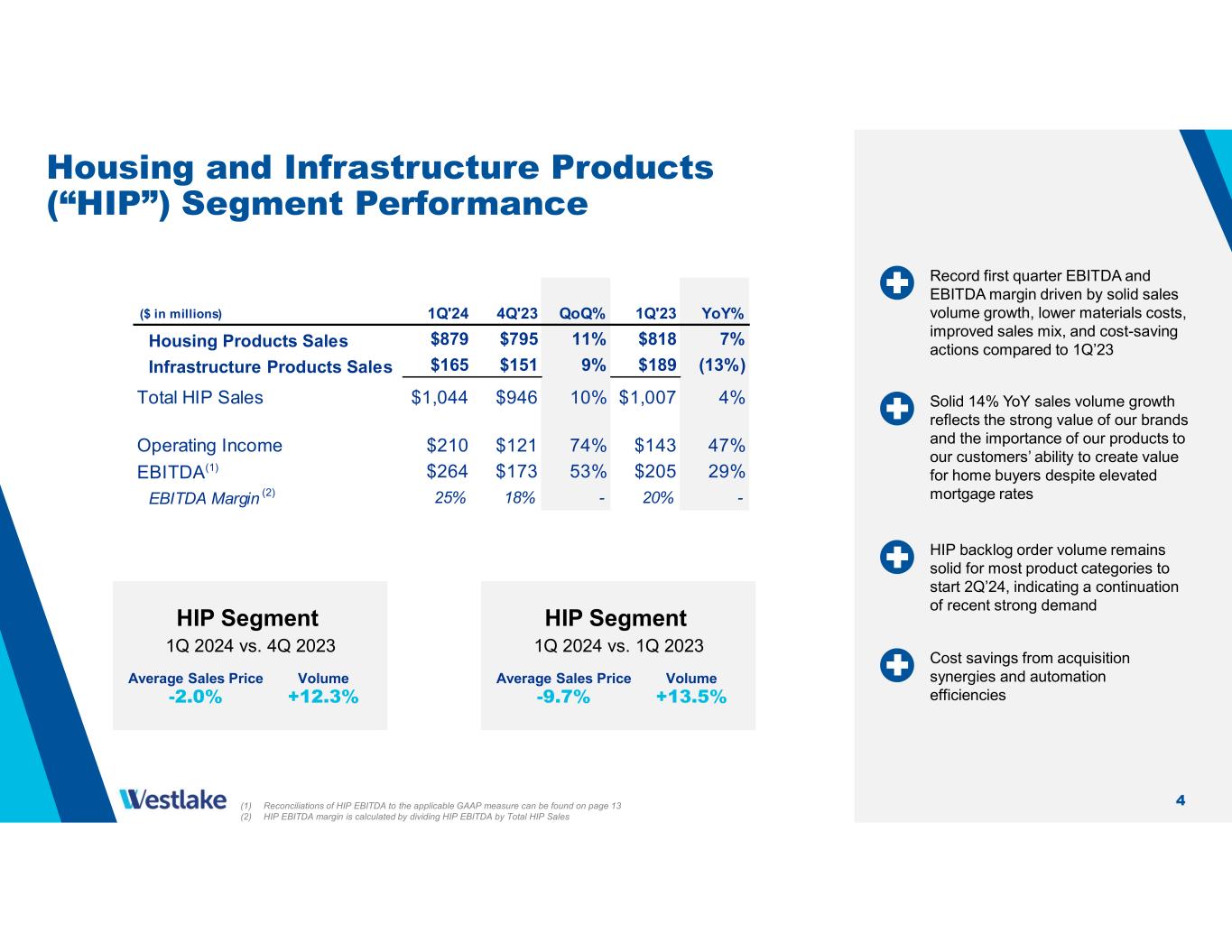 3 Westlake Corporation 1Q 2024 Record HIP first quarter EBITDA of $264 million and EBITDA margin of 25% Lower YoY average sales price driven by caustic soda, PVC resin and Epoxy resin due to price reductions that occurred in mid-2023 Slowly improving global macro- economic conditions driving volumes and stabilizing prices in PEM Solid 8% YoY sales volume growth with contributions from each segment led by Pipe & Fittings and Siding & Trim in HIP and chlorovinyls in PEM (1) Excludes “Identified Items” consisting of a $475 million non-cash impairment charge and a $150 million charge to fully resolve certain claims (2) Reconciliations of EBITDA excl. Identified Items, Performance and Essential Materials EBITDA excl. Identified Items, Housing and Infrastructure Products EBITDA and Corporate EBITDA to the applicable GAAP measures can be found on pages 12 and 13 Westlake 1Q 2024 vs. 4Q 2023 Average Sales Price -1.1% Volume +6.4% Westlake 1Q 2024 vs. 1Q 2023 Average Sales Price -19.1% Volume +7.8% 1Q'24 4Q'23 QoQ% 1Q'23 YoY% $2,975 $2,826 5% $3,356 (11%) $ 223 $ 73 205% $536 (58%) Performance and Essential Materials $253 $201 26% $615 (59%) Housing and Infrastructure Products $264 $173 53% $205 29% Corporate $29 $16 - $5 - $546 $390 40% $825 (34%) Operating Income(1) Sales EBITDA(1,2) ($ in millions)