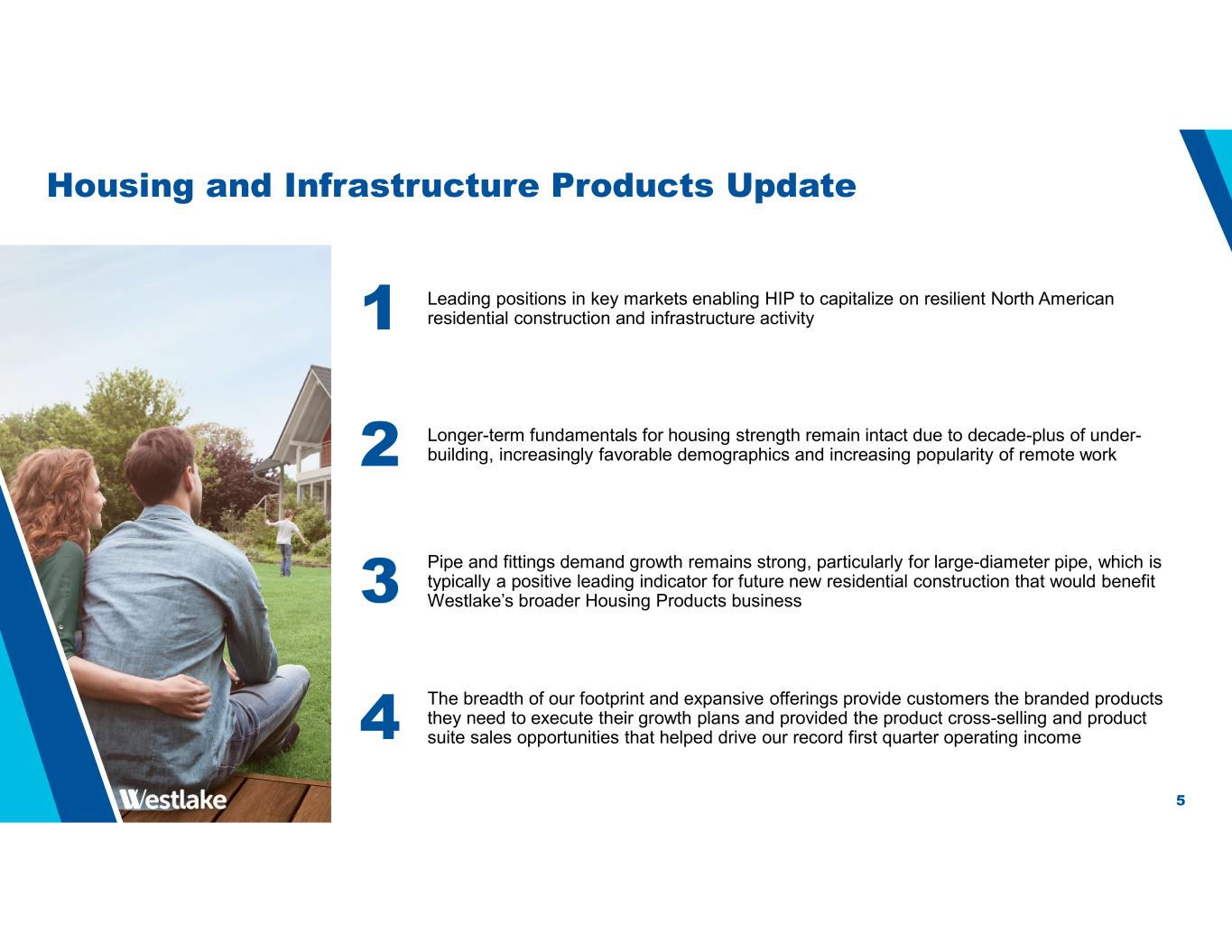 4 Housing and Infrastructure Products (“HIP”) Segment Performance HIP Segment 1Q 2024 vs. 4Q 2023 Average Sales Price -2.0% Volume +12.3% HIP Segment 1Q 2024 vs. 1Q 2023 Average Sales Price -9.7% Volume +13.5% Record first quarter EBITDA and EBITDA margin driven by solid sales volume growth, lower materials costs, improved sales mix, and cost-saving actions compared to 1Q’23 Solid 14% YoY sales volume growth reflects the strong value of our brands and the importance of our products to our customers’ ability to create value for home buyers despite elevated mortgage rates Cost savings from acquisition synergies and automation efficiencies HIP backlog order volume remains solid for most product categories to start 2Q’24, indicating a continuation of recent strong demand (1) Reconciliations of HIP EBITDA to the applicable GAAP measure can be found on page 13 (2) HIP EBITDA margin is calculated by dividing HIP EBITDA by Total HIP Sales 1Q'24 4Q'23 QoQ% 1Q'23 YoY% Housing Products Sales $879 $795 11% $818 7% Infrastructure Products Sales $165 $151 9% $189 (13%) Total HIP Sales $1,044 $946 10% $1,007 4% Operating Income $210 $121 74% $143 47% EBITDA(1) $264 $173 53% $205 29% EBITDA Margin (2) 25% 18% - 20% - ($ in millions)
