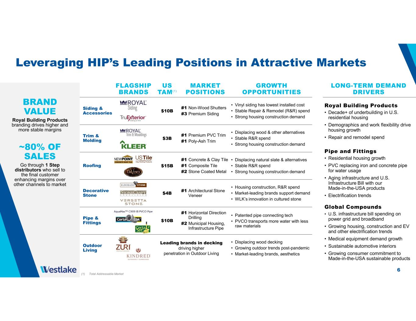 5 Housing and Infrastructure Products Update 2 Longer-term fundamentals for housing strength remain intact due to decade-plus of under- building, increasingly favorable demographics and increasing popularity of remote work 3 Pipe and fittings demand growth remains strong, particularly for large-diameter pipe, which is typically a positive leading indicator for future new residential construction that would benefit Westlake’s broader Housing Products business 4 The breadth of our footprint and expansive offerings provide customers the branded products they need to execute their growth plans and provided the product cross-selling and product suite sales opportunities that helped drive our record first quarter operating income 1 Leading positions in key markets enabling HIP to capitalize on resilient North American residential construction and infrastructure activity