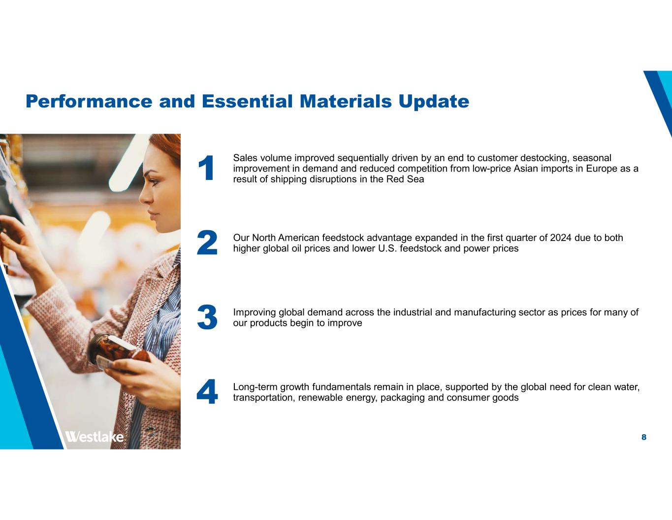 8 Performance and Essential Materials Update 2 Our North American feedstock advantage expanded in the first quarter of 2024 due to both higher global oil prices and lower U.S. feedstock and power prices 3 Improving global demand across the industrial and manufacturing sector as prices for many of our products begin to improve 4 Long-term growth fundamentals remain in place, supported by the global need for clean water, transportation, renewable energy, packaging and consumer goods 1 Sales volume improved sequentially driven by an end to customer destocking, seasonal improvement in demand and reduced competition from low-price Asian imports in Europe as a result of shipping disruptions in the Red Sea