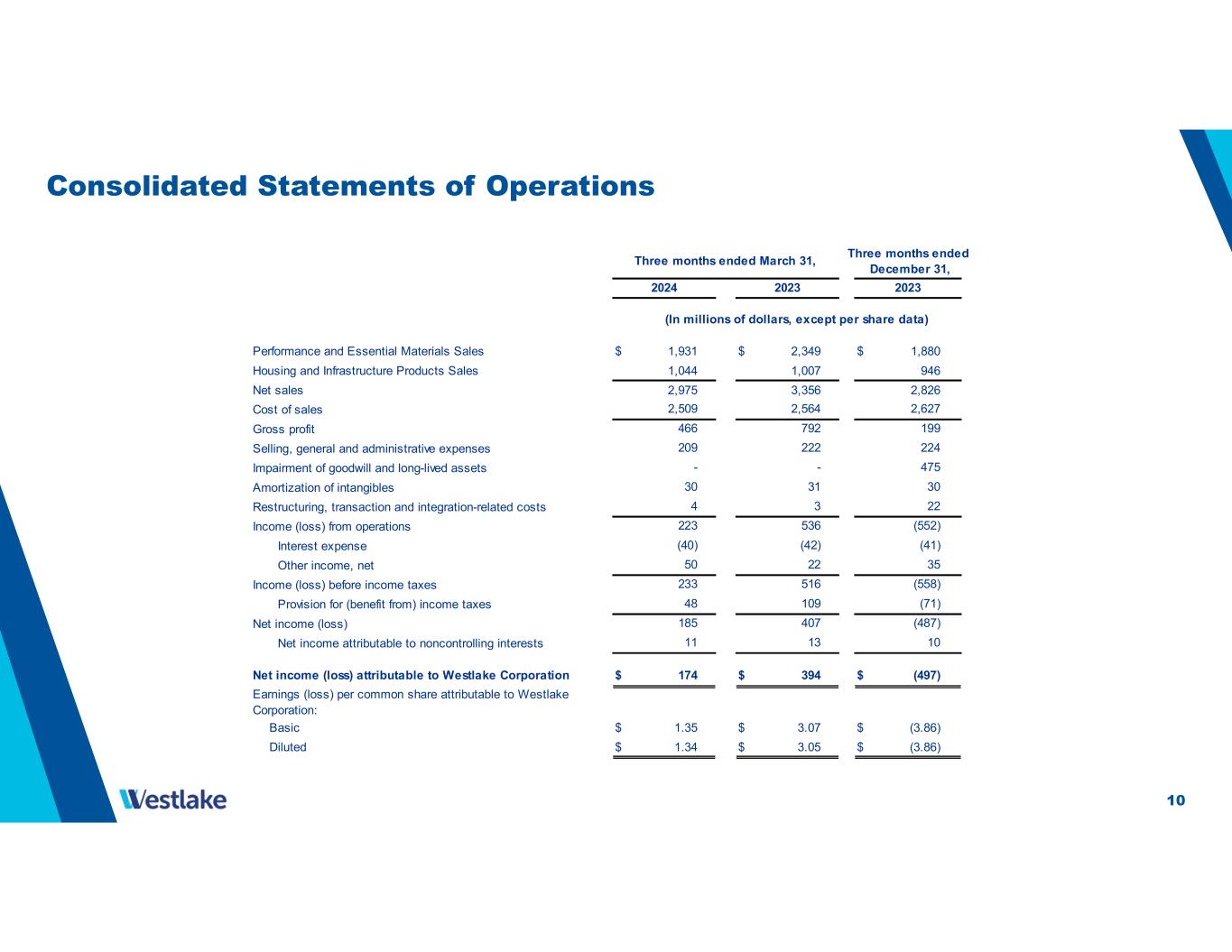 10 Consolidated Statements of Operations Performance and Essential Materials Sales $ 1,931 $ 2,349 $ 1,880 Housing and Infrastructure Products Sales 1,044 1,007 946 Net sales 2,975 3,356 2,826 Cost of sales Gross profit Selling, general and administrative expenses Impairment of goodwill and long-lived assets Amortization of intangibles Restructuring, transaction and integration-related costs Income (loss) from operations Interest expense Other income, net Income (loss) before income taxes Provision for (benefit from) income taxes Net income (loss) Net income attributable to noncontrolling interests Net income (loss) attributable to Westlake Corporation $ 174 $ 394 $ (497) Earnings (loss) per common share attributable to Westlake Corporation: Basic $ 1.35 $ 3.07 $ (3.86) Diluted $ 1.34 $ 3.05 $ (3.86) 13 10 11 (487) 109 22 (552) (41) 35 2023 (In millions of dollars, except per share data) (558) (71) 48 (40) (42) 407 233 516 50 22 185 4 3 223 536 - - 475 30 31 30 209 222 224 Three months ended March 31, Three months ended December 31, 466 792 2023 2,627 199 2,509 2,564 2024