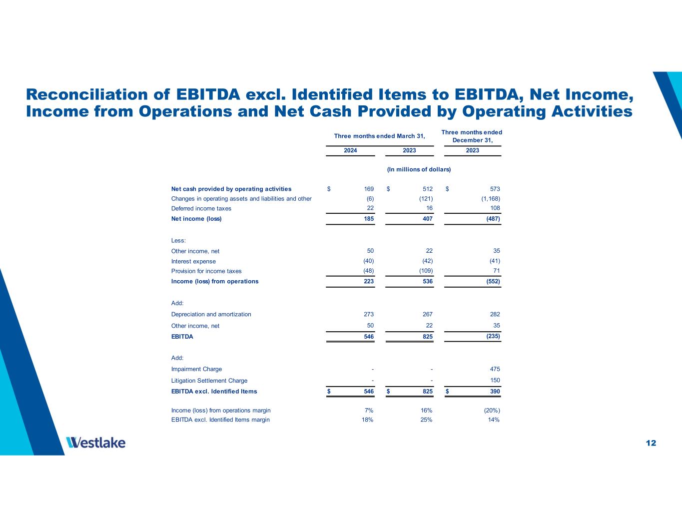 11 Reconciliation of Net Income Attributable to Westlake Corporation and Earnings Per Diluted Share to Net Income and Diluted Earnings Per Share excl. Identified Items Net income (loss) $ 185 $ 407 $ (487) Less: Net income attributable to noncontrolling interests Net income (loss) attributable to Westlake Corporation 174 394 (497) Add: Impairment charge, after-tax Litigation settlement charge of $150 million, after-tax Net income attributable to Westlake Corporation excl. Identified Items $ 174 $ 394 $ 93 Diluted earnings (loss) per common share attributable to Westlake Corporation $ 1.34 $ 3.05 $ (3.86) Add: Impairment charge per share 3.69 Litigation settlement charge per share 0.89 Diluted earnings per common share attributable to Westlake Corporation excl. Identified Items $ 1.34 $ 3.05 $ 0.72 - - - - - 475 115 - 11 13 10 - - Three months ended March 31, Three months ended December 31, 2024 2023 2023 (In millions of dollars, except per share data)