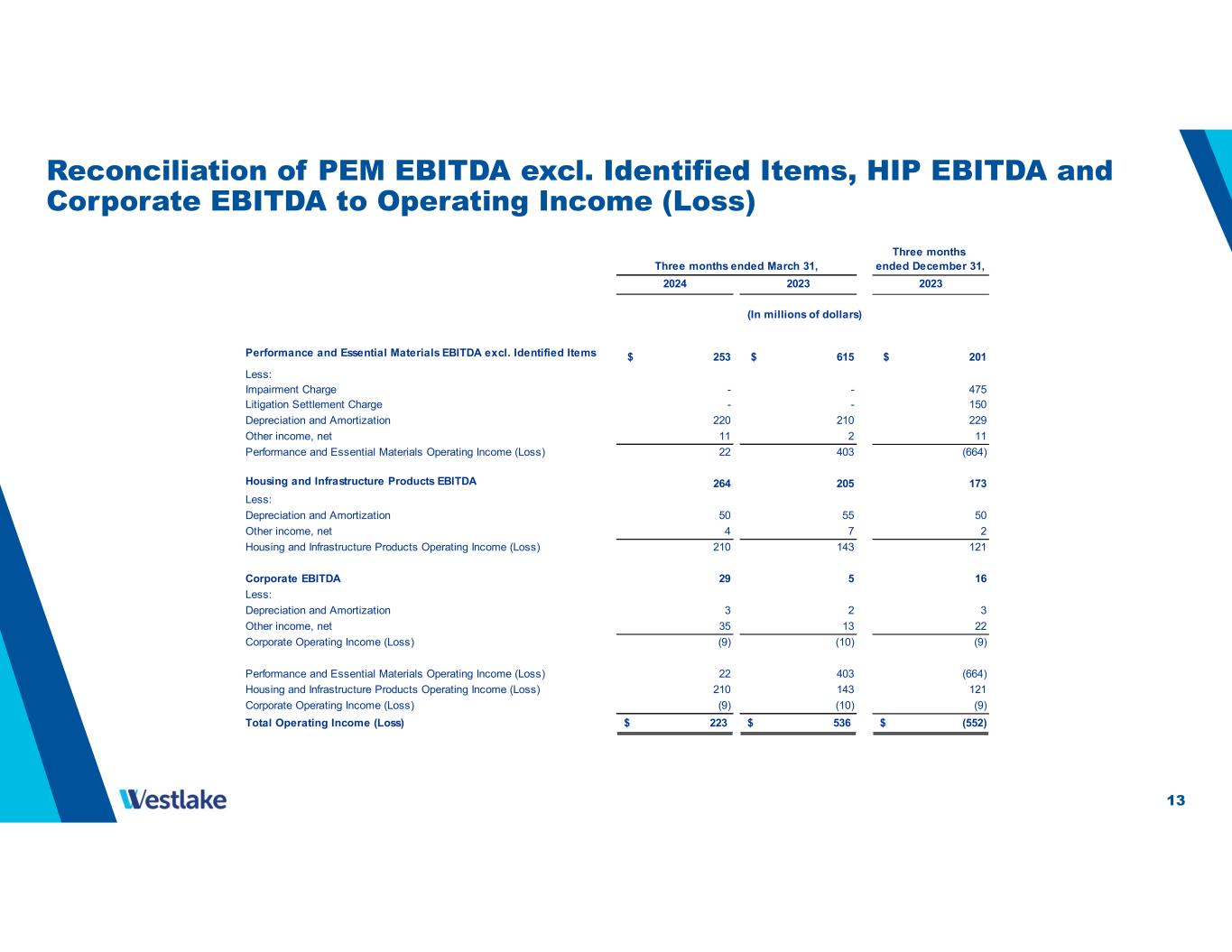 12 Reconciliation of EBITDA excl. Identified Items to EBITDA, Net Income, Income from Operations and Net Cash Provided by Operating Activities Net cash provided by operating activities $ 169 $ 512 $ 573 Changes in operating assets and liabilities and other Deferred income taxes Net income (loss) Less: Other income, net Interest expense Provision for income taxes Income (loss) from operations Add: Depreciation and amortization Other income, net EBITDA 546 825 Add: Impairment Charge Litigation Settlement Charge EBITDA excl. Identified Items $ 546 $ 825 $ 390 Income (loss) from operations margin 7% 16% (20%) EBITDA excl. Identified Items margin 18% 25% 14% - - 150 - - 475 Three months ended March 31, 20232024 2023 Three months ended December 31, (In millions of dollars) (1,168)(6) (121) 108 22 16 (487)185 407 (41)(40) (42) 35 50 22 (552) 223 536 71 (48) (109) 35 50 22 282 273 267 (235)