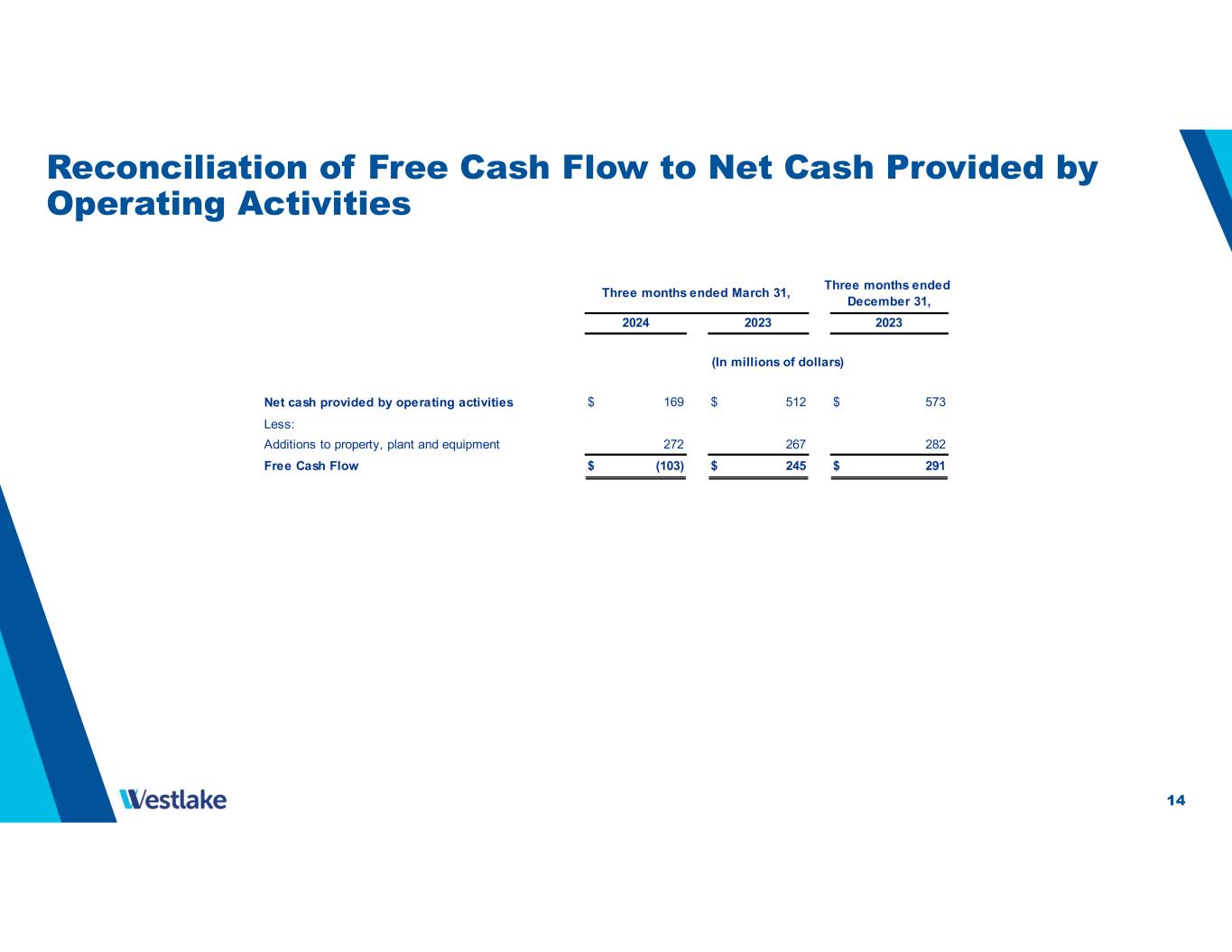 13 Reconciliation of PEM EBITDA excl. Identified Items, HIP EBITDA and Corporate EBITDA to Operating Income (Loss) Three months ended March 31, Three months ended December 31, 2024 2023 2023 Performance and Essential Materials EBITDA excl. Identified Items $ 253 $ 615 $ 201 Less: Impairment Charge - - 475 Litigation Settlement Charge - - 150 Depreciation and Amortization 220 210 229 Other income, net 11 2 11 Performance and Essential Materials Operating Income (Loss) 22 403 (664) Housing and Infrastructure Products EBITDA 264 205 173 Less: Depreciation and Amortization 50 55 50 Other income, net 4 7 2 Housing and Infrastructure Products Operating Income (Loss) 210 143 121 Corporate EBITDA 29 5 16 Less: Depreciation and Amortization 3 2 3 Other income, net 35 13 22 Corporate Operating Income (Loss) (9) (10) (9) Performance and Essential Materials Operating Income (Loss) 22 403 (664) Housing and Infrastructure Products Operating Income (Loss) 210 143 121 Corporate Operating Income (Loss) (9) (10) (9) Total Operating Income (Loss) 223$ 536$ (552)$ (In millions of dollars)