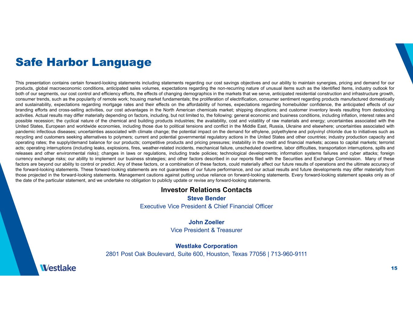 15 Safe Harbor Language This presentation contains certain forward-looking statements including statements regarding our cost savings objectives and our ability to maintain synergies, pricing and demand for our products, global macroeconomic conditions, anticipated sales volumes, expectations regarding the non-recurring nature of unusual items such as the Identified Items, industry outlook for both of our segments, our cost control and efficiency efforts, the effects of changing demographics in the markets that we serve, anticipated residential construction and infrastructure growth, consumer trends, such as the popularity of remote work; housing market fundamentals; the proliferation of electrification, consumer sentiment regarding products manufactured domestically and sustainability, expectations regarding mortgage rates and their effects on the affordability of homes, expectations regarding homebuilder confidence, the anticipated effects of our branding efforts and cross-selling activities, our cost advantages in the North American chemicals market; shipping disruptions; and customer inventory levels resulting from destocking activities. Actual results may differ materially depending on factors, including, but not limited to, the following: general economic and business conditions, including inflation, interest rates and possible recession; the cyclical nature of the chemical and building products industries; the availability, cost and volatility of raw materials and energy; uncertainties associated with the United States, European and worldwide economies, including those due to political tensions and conflict in the Middle East, Russia, Ukraine and elsewhere; uncertainties associated with pandemic infectious diseases; uncertainties associated with climate change; the potential impact on the demand for ethylene, polyethylene and polyvinyl chloride due to initiatives such as recycling and customers seeking alternatives to polymers; current and potential governmental regulatory actions in the United States and other countries; industry production capacity and operating rates; the supply/demand balance for our products; competitive products and pricing pressures; instability in the credit and financial markets; access to capital markets; terrorist acts; operating interruptions (including leaks, explosions, fires, weather-related incidents, mechanical failure, unscheduled downtime, labor difficulties, transportation interruptions, spills and releases and other environmental risks); changes in laws or regulations, including trade policies; technological developments; information systems failures and cyber attacks; foreign currency exchange risks; our ability to implement our business strategies; and other factors described in our reports filed with the Securities and Exchange Commission. Many of these factors are beyond our ability to control or predict. Any of these factors, or a combination of these factors, could materially affect our future results of operations and the ultimate accuracy of the forward-looking statements. These forward-looking statements are not guarantees of our future performance, and our actual results and future developments may differ materially from those projected in the forward-looking statements. Management cautions against putting undue reliance on forward-looking statements. Every forward-looking statement speaks only as of the date of the particular statement, and we undertake no obligation to publicly update or revise any forward-looking statements. Investor Relations Contacts Steve Bender Executive Vice President & Chief Financial Officer John Zoeller Vice President & Treasurer Westlake Corporation 2801 Post Oak Boulevard, Suite 600, Houston, Texas 77056 | 713-960-9111