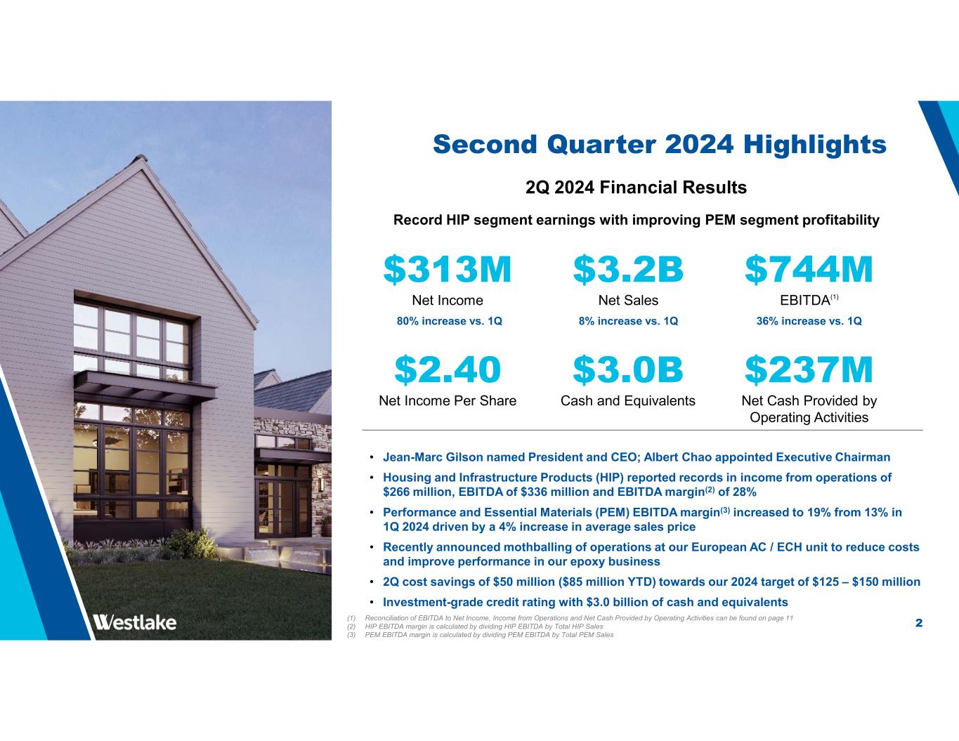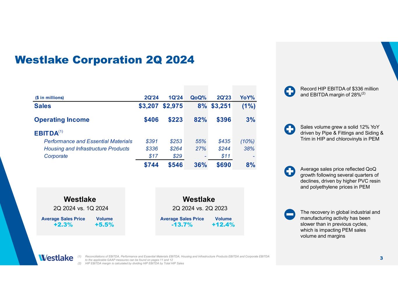 2 Second Quarter 2024 Highlights 2Q 2024 Financial Results Record HIP segment earnings with improving PEM segment profitability • Jean-Marc Gilson named President and CEO; Albert Chao appointed Executive Chairman • Housing and Infrastructure Products (HIP) reported records in income from operations of $266 million, EBITDA of $336 million and EBITDA margin(2) of 28% • Performance and Essential Materials (PEM) EBITDA margin(3) increased to 19% from 13% in 1Q 2024 driven by a 4% increase in average sales price • Recently announced mothballing of operations at our European AC / ECH unit to reduce costs and improve performance in our epoxy business • 2Q cost savings of $50 million ($85 million YTD) towards our 2024 target of $125 – $150 million • Investment-grade credit rating with $3.0 billion of cash and equivalents $3.2B Net Sales 8% increase vs. 1Q $313M Net Income 80% increase vs. 1Q $744M EBITDA(1) 36% increase vs. 1Q $2.40 Net Income Per Share $237M Net Cash Provided by Operating Activities $3.0B Cash and Equivalents (1) Reconciliation of EBITDA to Net Income, Income from Operations and Net Cash Provided by Operating Activities can be found on page 11 (2) HIP EBITDA margin is calculated by dividing HIP EBITDA by Total HIP Sales (3) PEM EBITDA margin is calculated by dividing PEM EBITDA by Total PEM Sales