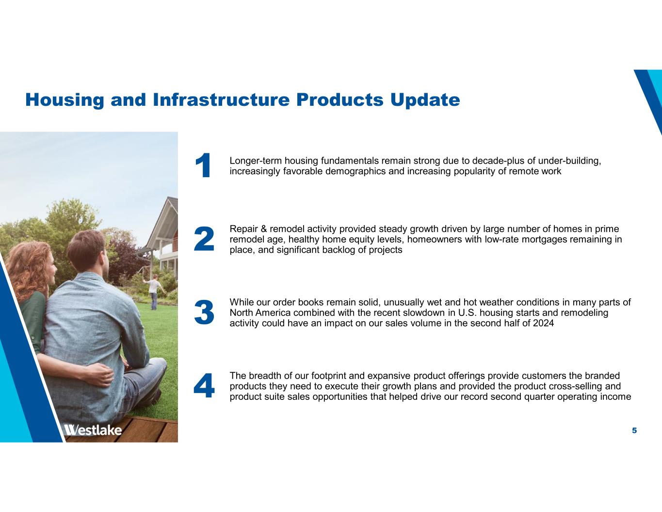 4 Housing and Infrastructure Products (“HIP”) Segment Performance HIP Segment 2Q 2024 vs. 1Q 2024 Average Sales Price -0.3% Volume +14.7% HIP Segment 2Q 2024 vs. 2Q 2023 Average Sales Price -8.7% Volume +15.7% Record EBITDA and EBITDA margin driven by solid sales volume growth, lower materials costs, improved sales mix, and cost-saving actions Sales volume growth of 16% YoY was the highest since the Boral acquisition, and reflects our strong position with the faster-growing segments of the North American residential construction market Announced plans to build a new PVCO pipe plant to support the strong growth and market adoption for this innovative sustainable product Manufacturing plant optimization and automation contributed to the solid YoY and QoQ margin expansion 2Q'24 1Q'24 QoQ% 2Q'23 YoY% Housing Products Sales $1,010 $879 15% $918 10% Infrastructure Products Sales $184 $165 12% $197 (7%) Total HIP Sales $1,194 $1,044 14% $1,115 7% Operating Income $266 $210 27% $190 40% EBITDA(1) $336 $264 27% $244 38% EBITDA Margin (2) 28% 25% - 22% - ($ in millions) (1) Reconciliations of HIP EBITDA to the applicable GAAP measure can be found on page 12 (2) HIP EBITDA margin is calculated by dividing HIP EBITDA by Total HIP Sales