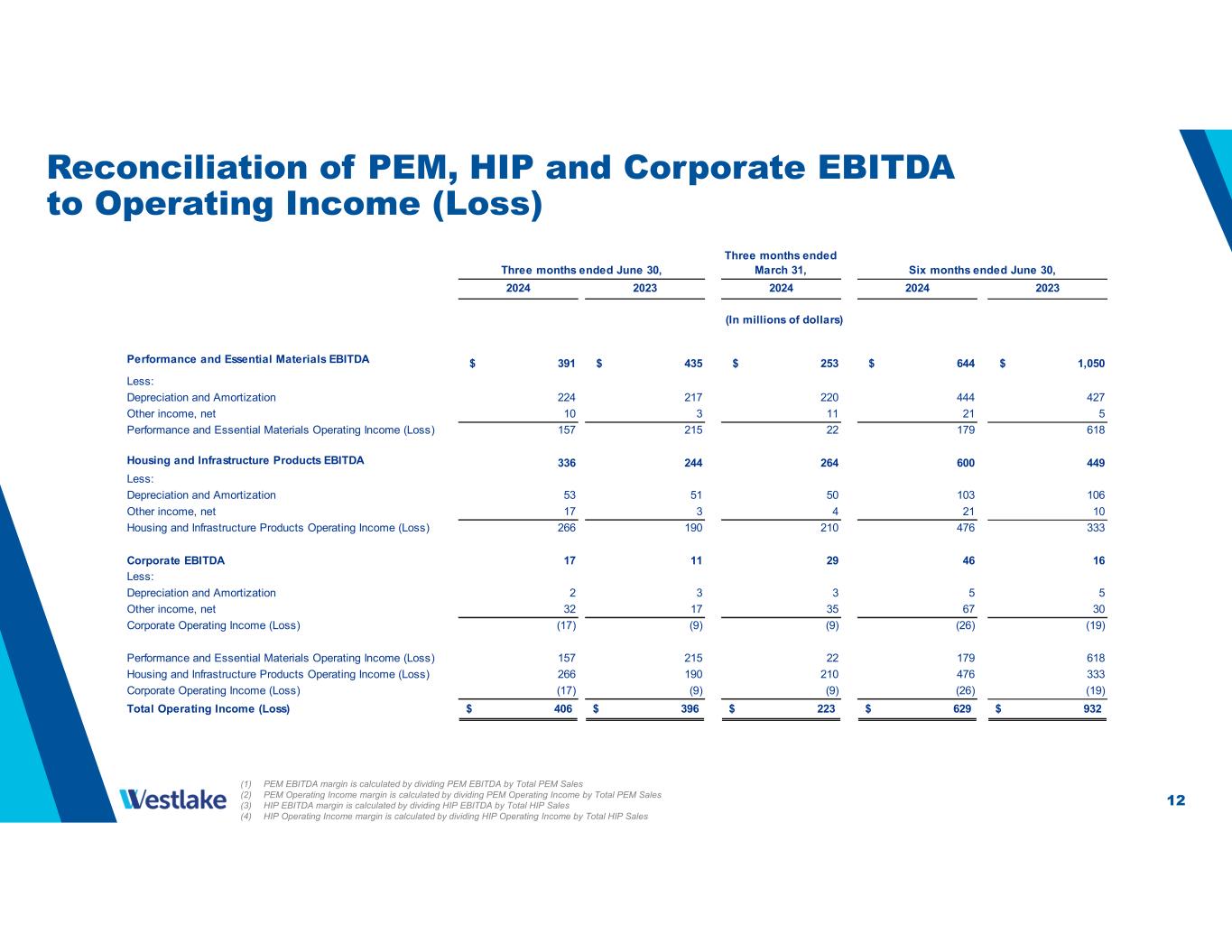 12 Reconciliation of PEM, HIP and Corporate EBITDA to Operating Income (Loss) Three months ended June 30, Three months ended March 31, Six months ended June 30, 2024 2023 2024 2024 2023 Performance and Essential Materials EBITDA $ 391 $ 435 $ 253 $ 644 $ 1,050 Less: Depreciation and Amortization 224 217 220 444 427 Other income, net 10 3 11 21 5 Performance and Essential Materials Operating Income (Loss) 157 215 22 179 618 Housing and Infrastructure Products EBITDA 336 244 264 600 449 Less: Depreciation and Amortization 53 51 50 103 106 Other income, net 17 3 4 21 10 Housing and Infrastructure Products Operating Income (Loss) 266 190 210 476 333 Corporate EBITDA 17 11 29 46 16 Less: Depreciation and Amortization 2 3 3 5 5 Other income, net 32 17 35 67 30 Corporate Operating Income (Loss) (17) (9) (9) (26) (19) Performance and Essential Materials Operating Income (Loss) 157 215 22 179 618 Housing and Infrastructure Products Operating Income (Loss) 266 190 210 476 333 Corporate Operating Income (Loss) (17) (9) (9) (26) (19) Total Operating Income (Loss) 406$ 396$ 223$ 629$ 932$ (In millions of dollars) (1) PEM EBITDA margin is calculated by dividing PEM EBITDA by Total PEM Sales (2) PEM Operating Income margin is calculated by dividing PEM Operating Income by Total PEM Sales (3) HIP EBITDA margin is calculated by dividing HIP EBITDA by Total HIP Sales (4) HIP Operating Income margin is calculated by dividing HIP Operating Income by Total HIP Sales