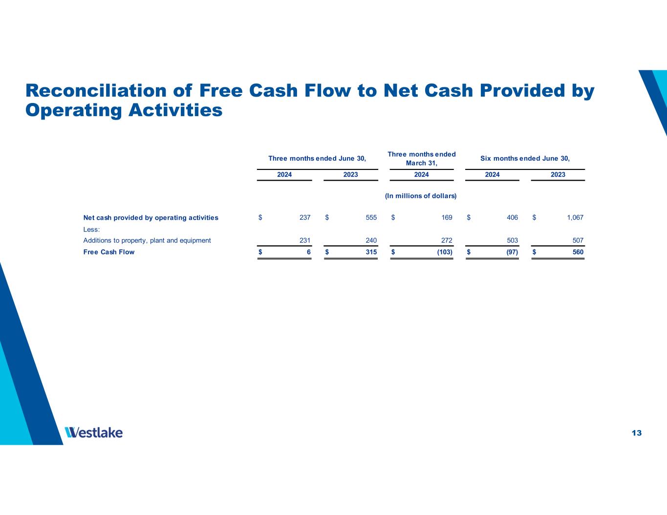 13 Reconciliation of Free Cash Flow to Net Cash Provided by Operating Activities Net cash provided by operating activities $ 237 $ 555 $ 169 $ 406 $ 1,067 Less: Additions to property, plant and equipment Free Cash Flow $ 6 $ 315 $ (103) $ (97) $ 560 (In millions of dollars) Three months ended June 30, Three months ended March 31, Six months ended June 30, 2024 2023 2024 2024 2023 231 240 272 503 507