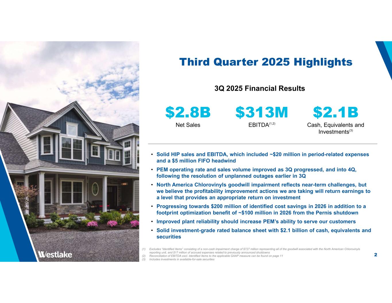 2 Third Quarter 2025 Highlights • Solid HIP sales and EBITDA, which included ~$20 million in period-related expenses and a $5 million FIFO headwind • PEM operating rate and sales volume improved as 3Q progressed, and into 4Q, following the resolution of unplanned outages earlier in 3Q • North America Chlorovinyls goodwill impairment reflects near-term challenges, but we believe the profitability improvement actions we are taking will return earnings to a level that provides an appropriate return on investment • Progressing towards $200 million of identified cost savings in 2026 in addition to a footprint optimization benefit of ~$100 million in 2026 from the Pernis shutdown • Improved plant reliability should increase PEM’s ability to serve our customers • Solid investment-grade rated balance sheet with $2.1 billion of cash, equivalents and securities (1) Excludes “Identified Items” consisting of a non-cash impairment charge of $727 million representing all of the goodwill associated with the North American Chlorovinyls reporting unit, and $17 million of accrued expenses related to previously announced shutdowns (2) Reconciliation of EBITDA excl. Identified Items to the applicable GAAP measure can be found on page 11 (3) Includes investments in available-for-sale securities 3Q 2025 Financial Results $313M EBITDA(1,2) $2.8B Net Sales $2.1B Cash, Equivalents and Investments(3)
