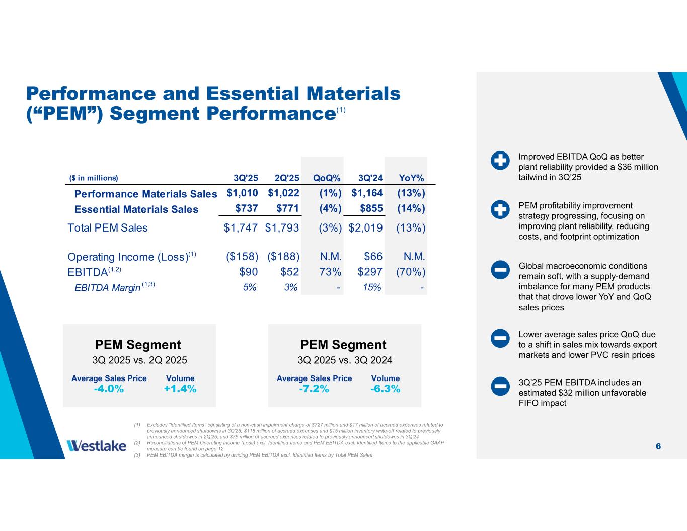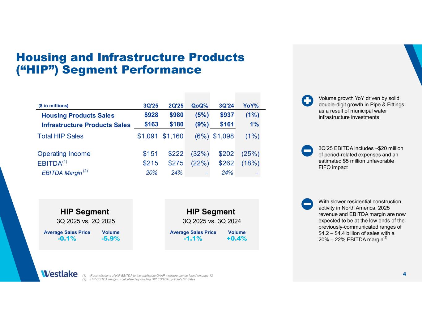 3 Westlake Corporation 3Q 2025 Identified Items consisting of a non-cash goodwill impairment charge of $727 million and $17 million of accrued expenses related to previously announced shutdowns negatively impacted PEM segment reported earnings Westlake 3Q 2025 vs. 2Q 2025 Average Sales Price -2.4% Volume -1.4% Westlake 3Q 2025 vs. 3Q 2024 Average Sales Price -5.0% Volume -3.9% (1) Excludes “Identified Items” consisting of a non-cash impairment charge of $727 million and $17 million of accrued expenses related to previously announced shutdowns in 3Q’25; $115 million of accrued expenses and $15 million inventory write-off related to previously announced shutdowns in 2Q’25; and $75 million of accrued expenses related to previously announced shutdowns in 3Q’24 (2) Reconciliations of Operating Income (Loss) excl. Identified Items, HIP EBITDA and PEM EBITDA excl. Identified Items to the applicable GAAP measure can be found on pages 11 and 12 Achieved ~$115 million of company- wide cost savings YTD, including $40 million in 3Q’25, towards our FY’25 target of $150 – $175 million 3Q'25 2Q'25 QoQ% 3Q'24 YoY% $2,838 $2,953 (4%) $3,117 (9%) ($22) $21 N.M. $255 N.M. Housing and Infrastructure Products $215 $275 (22%) $262 (18%) Performance and Essential Materials $90 $52 73% $297 (70%) Corporate $8 $13 - $21 - $313 $340 (8%) $580 (46%) Operating Income (Loss)(1) Sales EBITDA(1,2 ) ($ in millions) EBITDA margin contracted YoY due to lower average sales price and higher input costs, including higher North American feedstock and energy costs