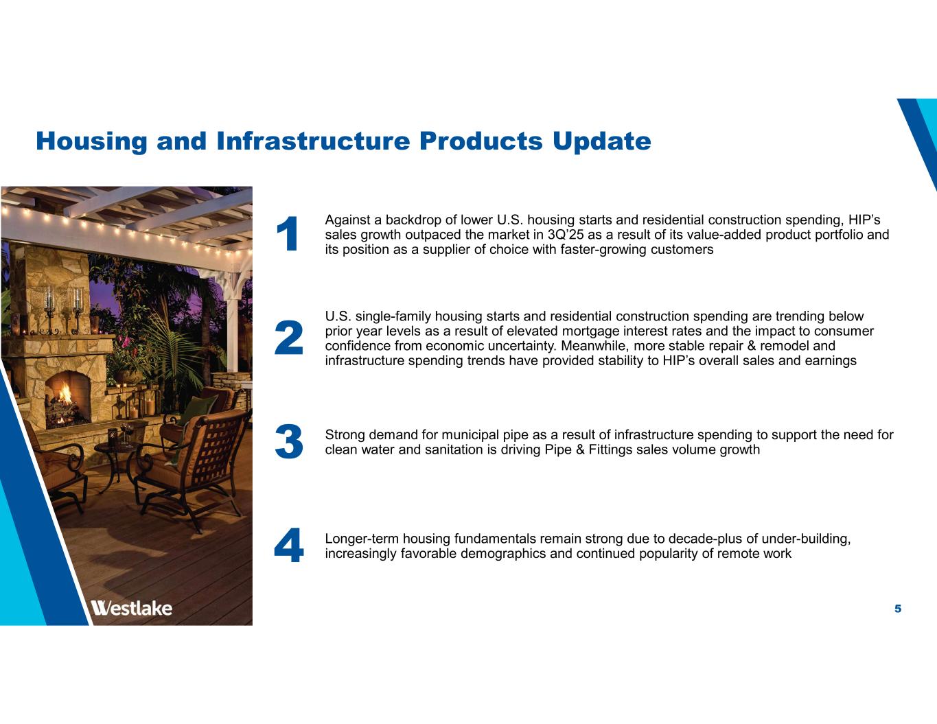 4 Housing and Infrastructure Products (“HIP”) Segment Performance HIP Segment 3Q 2025 vs. 2Q 2025 Average Sales Price -0.1% Volume -5.9% HIP Segment 3Q 2025 vs. 3Q 2024 Average Sales Price -1.1% Volume +0.4% 3Q’25 EBITDA includes ~$20 million of period-related expenses and an estimated $5 million unfavorable FIFO impact (1) Reconciliations of HIP EBITDA to the applicable GAAP measure can be found on page 12 (2) HIP EBITDA margin is calculated by dividing HIP EBITDA by Total HIP Sales Volume growth YoY driven by solid double-digit growth in Pipe & Fittings as a result of municipal water infrastructure investments 3Q'25 2Q'25 QoQ% 3Q'24 YoY% Housing Products Sales $928 $980 (5%) $937 (1%) Infrastructure Products Sales $163 $180 (9%) $161 1% Total HIP Sales $1,091 $1,160 (6%) $1,098 (1%) Operating Income $151 $222 (32%) $202 (25%) EBITDA(1) $215 $275 (22%) $262 (18%) EBITDA Margin (2) 20% 24% - 24% - ($ in millions) With slower residential construction activity in North America, 2025 revenue and EBITDA margin are now expected to be at the low ends of the previously-communicated ranges of $4.2 – $4.4 billion of sales with a 20% – 22% EBITDA margin(2)