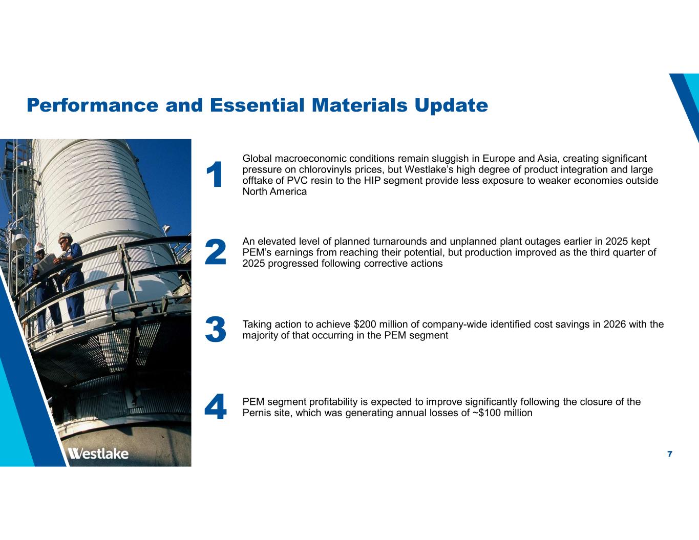 6 PEM Segment 3Q 2025 vs. 2Q 2025 Average Sales Price -4.0% Volume +1.4% PEM Segment 3Q 2025 vs. 3Q 2024 Average Sales Price -7.2% Volume -6.3% PEM profitability improvement strategy progressing, focusing on improving plant reliability, reducing costs, and footprint optimization Improved EBITDA QoQ as better plant reliability provided a $36 million tailwind in 3Q’25 (1) Excludes “Identified Items” consisting of a non-cash impairment charge of $727 million and $17 million of accrued expenses related to previously announced shutdowns in 3Q’25; $115 million of accrued expenses and $15 million inventory write-off related to previously announced shutdowns in 2Q’25; and $75 million of accrued expenses related to previously announced shutdowns in 3Q’24 (2) Reconciliations of PEM Operating Income (Loss) excl. Identified Items and PEM EBITDA excl. Identified Items to the applicable GAAP measure can be found on page 12 (3) PEM EBITDA margin is calculated by dividing PEM EBITDA excl. Identified Items by Total PEM Sales Performance and Essential Materials (“PEM”) Segment Performance(1) Lower average sales price QoQ due to a shift in sales mix towards export markets and lower PVC resin prices 3Q’25 PEM EBITDA includes an estimated $32 million unfavorable FIFO impact Global macroeconomic conditions remain soft, with a supply-demand imbalance for many PEM products that that drove lower YoY and QoQ sales prices 3Q'25 2Q'25 QoQ% 3Q'24 YoY% Performance Materials Sales $1,010 $1,022 (1%) $1,164 (13%) Essential Materials Sales $737 $771 (4%) $855 (14%) Total PEM Sales $1,747 $1,793 (3%) $2,019 (13%) Operating Income (Loss)(1) ($158) ($188) N.M. $66 N.M. EBITDA(1,2) $90 $52 73% $297 (70%) EBITDA Margin (1,3) 5% 3% - 15% - ($ in millions)