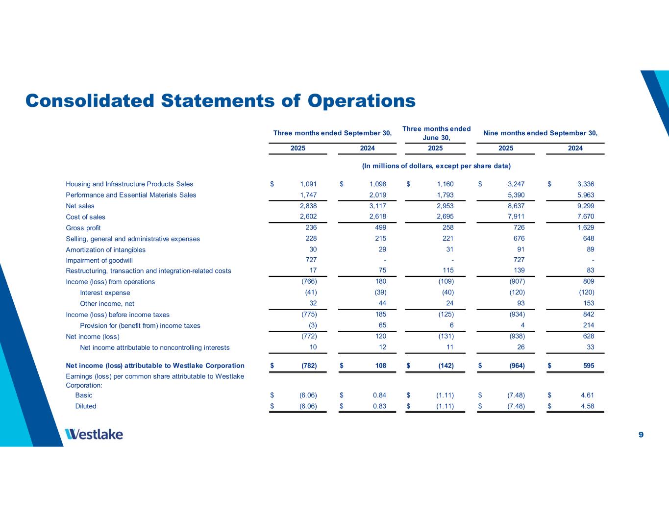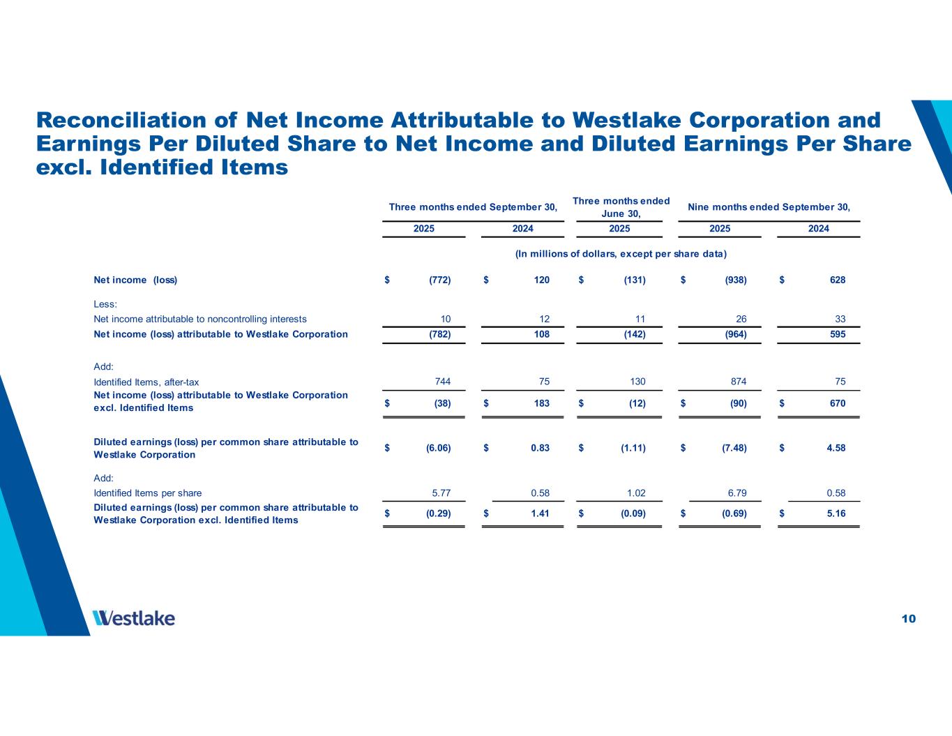 9 Consolidated Statements of Operations Housing and Infrastructure Products Sales $ 1,091 $ 1,098 $ 1,160 $ 3,247 $ 3,336 Performance and Essential Materials Sales 1,747 2,019 1,793 5,390 5,963 Net sales 2,838 3,117 2,953 8,637 9,299 Cost of sales Gross profit Selling, general and administrative expenses Amortization of intangibles Impairment of goodwill Restructuring, transaction and integration-related costs Income (loss) from operations Interest expense Other income, net Income (loss) before income taxes Provision for (benefit from) income taxes Net income (loss) Net income attributable to noncontrolling interests Net income (loss) attributable to Westlake Corporation $ (782) $ 108 $ (142) $ (964) $ 595 Earnings (loss) per common share attributable to Westlake Corporation: Basic $ (6.06) $ 0.84 $ (1.11) $ (7.48) $ 4.61 Diluted $ (6.06) $ 0.83 $ (1.11) $ (7.48) $ 4.58 12 26 33 11 10 (131) 65 4 214 115 (109) (40) 24 2024 2025 2024 (In millions of dollars, except per share data) (125) 6 (3) (41) (39) (120) (120) 120 (938) 628 (775) 185 (934) 842 32 44 93 153 (772) 17 75 139 83 (766) 180 (907) 809 727 - - 727 - 30 29 91 89 31 228 215 676 648 221 Three months ended September 30, Nine months ended September 30, Three months ended June 30, 236 499 726 1,629 2025 2,695 258 2,602 2,618 7,911 7,670 2025