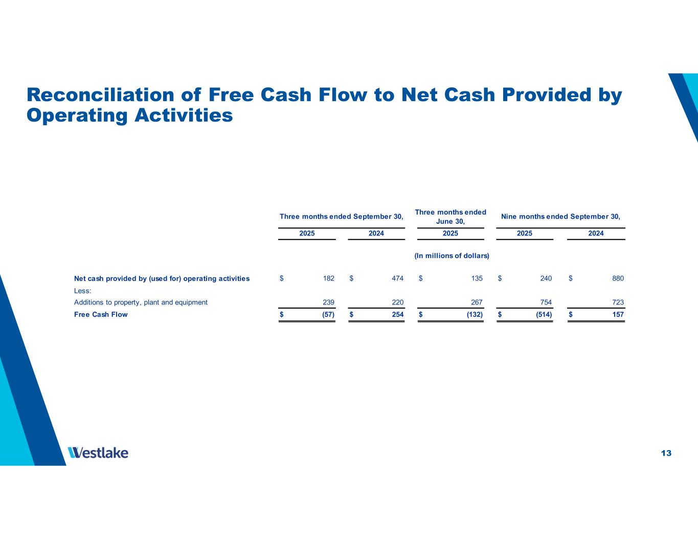 12 Reconciliation of PEM EBITDA excl. Identified Items, HIP EBITDA and Corporate EBITDA to Operating Income (Loss) Three months ended September 30, Three months ended June 30, Nine months ended September 30, 2025 2024 2025 2025 2024 Housing and Infrastructure Products EBITDA $ 215 $ 262 $ 275 $ 693 $ 862 Less: Depreciation and Amortization 62 54 55 170 157 Other income, net 2 6 (2) 2 27 Housing and Infrastructure Products Operating Income 151 202 222 521 678 Performance and Essential Materials EBITDA excl. Identified Items 90 297 52 215 941 Less: Identified Items 744 75 130 874 75 Depreciation and Amortization 238 225 236 701 669 Other income, net 10 6 4 23 27 Performance and Essential Materials Operating Income (Loss) (902) (9) (318) (1,383) 170 Corporate EBITDA 8 21 13 33 67 Less: Depreciation and Amortization 3 2 4 10 7 Other income, net 20 32 22 68 99 Corporate Operating Income (Loss) (15) (13) (13) (45) (39) Housing and Infrastructure Products Operating Income 151 202 222 521 678 Performance and Essential Materials Operating Income (Loss) (902) (9) (318) (1,383) 170 Corporate Operating Income (Loss) (15) (13) (13) (45) (39) Total Operating Income (Loss) (766)$ 180$ (109)$ (907)$ 809$ (In millions of dollars)