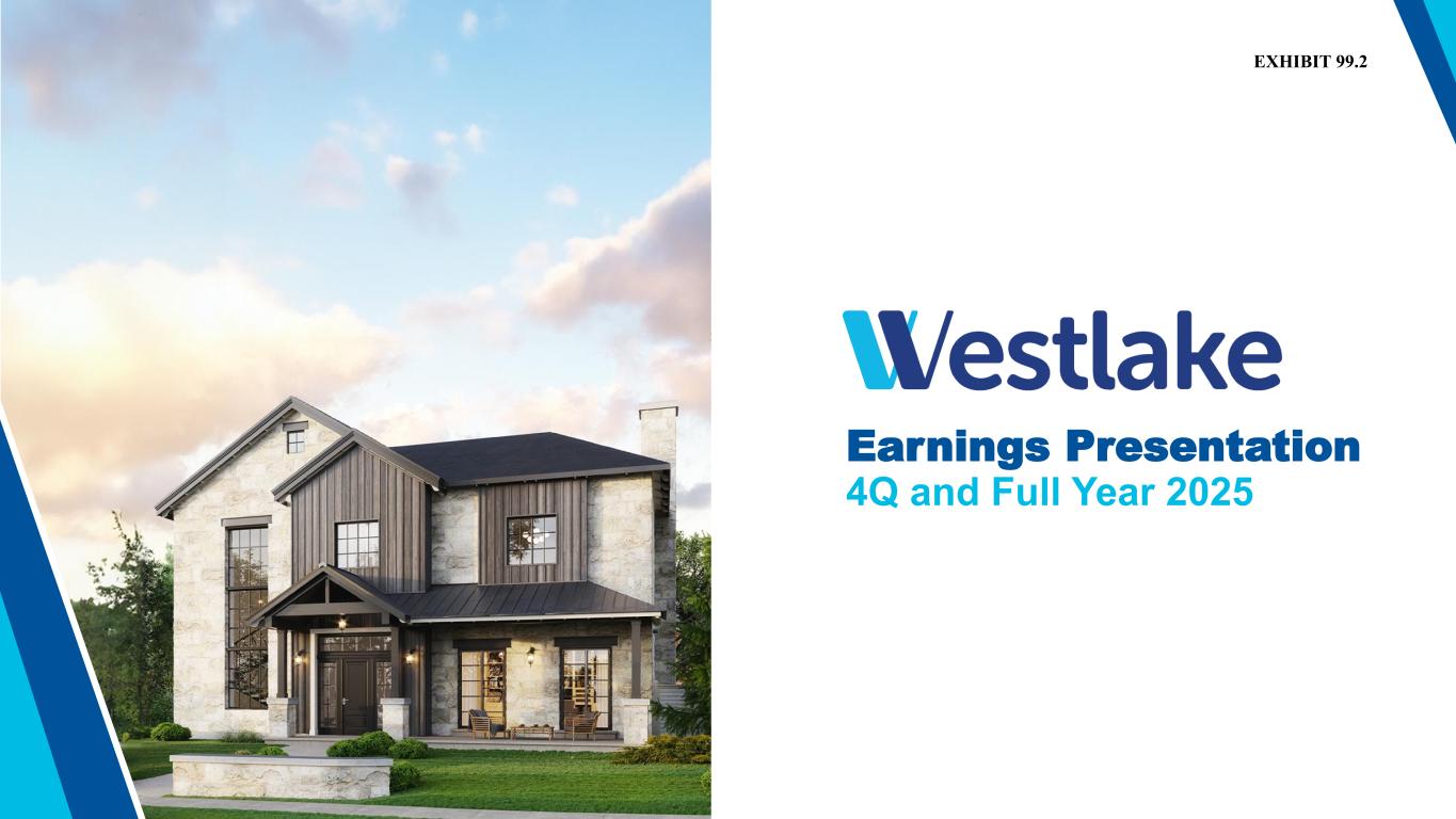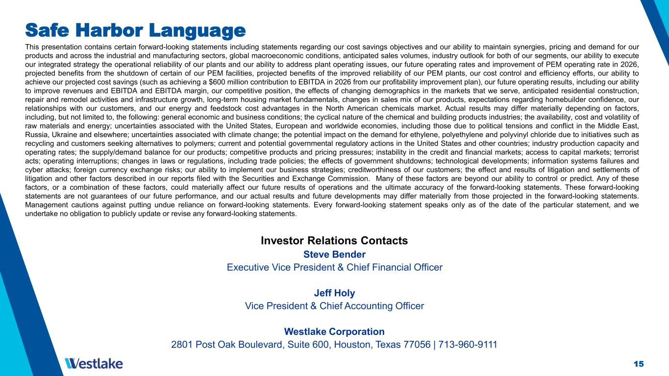 15 Safe Harbor Language This presentation contains certain forward-looking statements including statements regarding our cost savings objectives and our ability to maintain synergies, pricing and demand for our products and across the industrial and manufacturing sectors, global macroeconomic conditions, anticipated sales volumes, industry outlook for both of our segments, our ability to execute our integrated strategy the operational reliability of our plants and our ability to address plant operating issues, our future operating rates and improvement of PEM operating rate in 2026, projected benefits from the shutdown of certain of our PEM facilities, projected benefits of the improved reliability of our PEM plants, our cost control and efficiency efforts, our ability to achieve our projected cost savings (such as achieving a $600 million contribution to EBITDA in 2026 from our profitability improvement plan), our future operating results, including our ability to improve revenues and EBITDA and EBITDA margin, our competitive position, the effects of changing demographics in the markets that we serve, anticipated residential construction, repair and remodel activities and infrastructure growth, long-term housing market fundamentals, changes in sales mix of our products, expectations regarding homebuilder confidence, our relationships with our customers, and our energy and feedstock cost advantages in the North American chemicals market. Actual results may differ materially depending on factors, including, but not limited to, the following: general economic and business conditions; the cyclical nature of the chemical and building products industries; the availability, cost and volatility of raw materials and energy; uncertainties associated with the United States, European and worldwide economies, including those due to political tensions and conflict in the Middle East, Russia, Ukraine and elsewhere; uncertainties associated with climate change; the potential impact on the demand for ethylene, polyethylene and polyvinyl chloride due to initiatives such as recycling and customers seeking alternatives to polymers; current and potential governmental regulatory actions in the United States and other countries; industry production capacity and operating rates; the supply/demand balance for our products; competitive products and pricing pressures; instability in the credit and financial markets; access to capital markets; terrorist acts; operating interruptions; changes in laws or regulations, including trade policies; the effects of government shutdowns; technological developments; information systems failures and cyber attacks; foreign currency exchange risks; our ability to implement our business strategies; creditworthiness of our customers; the effect and results of litigation and settlements of litigation and other factors described in our reports filed with the Securities and Exchange Commission. Many of these factors are beyond our ability to control or predict. Any of these factors, or a combination of these factors, could materially affect our future results of operations and the ultimate accuracy of the forward-looking statements. These forward-looking statements are not guarantees of our future performance, and our actual results and future developments may differ materially from those projected in the forward-looking statements. Management cautions against putting undue reliance on forward-looking statements. Every forward-looking statement speaks only as of the date of the particular statement, and we undertake no obligation to publicly update or revise any forward-looking statements. Investor Relations Contacts Steve Bender Executive Vice President & Chief Financial Officer Jeff Holy Vice President & Chief Accounting Officer Westlake Corporation 2801 Post Oak Boulevard, Suite 600, Houston, Texas 77056 | 713-960-9111