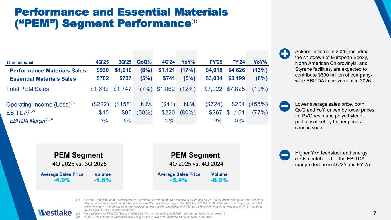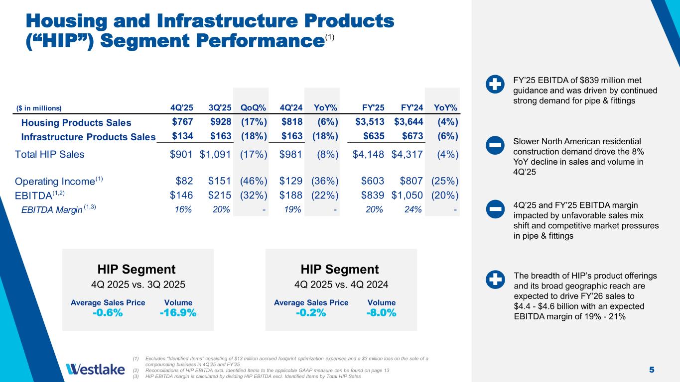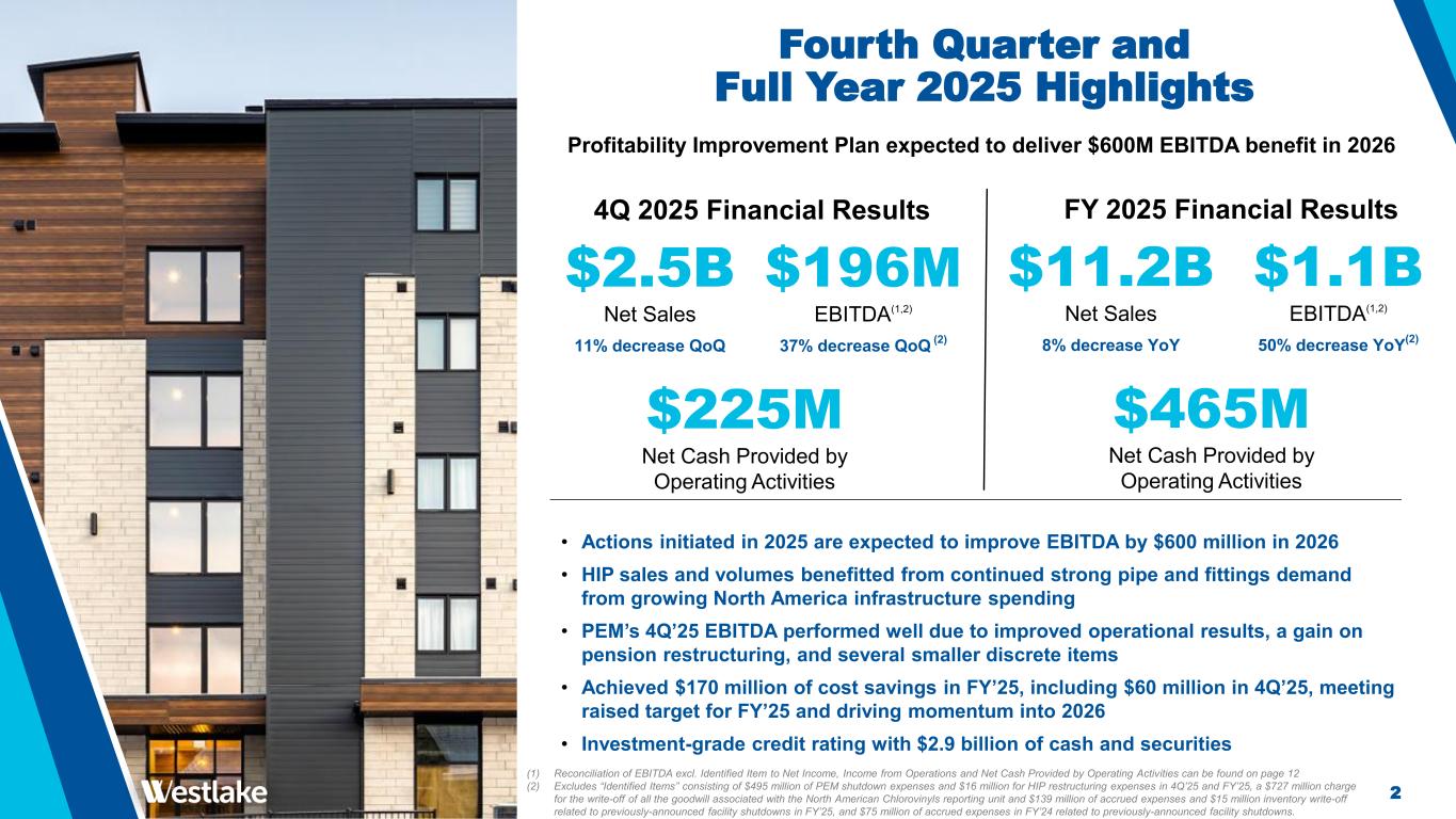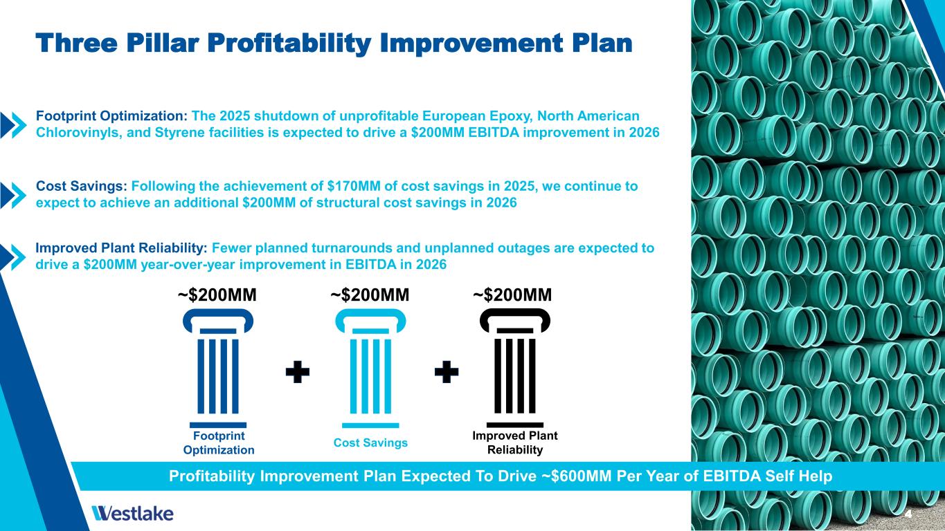 3 Westlake Corporation 4Q and FY 2025 (1) FY’25 EBITDA impacted by an elevated level of planned turnarounds and unplanned outages that are not expected to recur in FY’26 Exceeded our FY’25 cost reduction target by achieving $170 million of cost savings, including $60 million in 4Q’25 Westlake 4Q 2025 vs. 3Q 2025 Average Sales Price -3.3% Volume -7.5% Westlake 4Q 2025 vs. 4Q 2024 Average Sales Price -3.6% Volume -7.3% (1) Excludes “Identified Items” consisting of $495 million of PEM shutdown expenses and $16 million for HIP restructuring expenses in 4Q’25 and FY’25, a $727 million charge for the write-off of all the goodwill associated with the North American Chlorovinyls reporting unit in 3Q’25 and FY’25, $139 million of accrued expenses and $15 million inventory write-off related to previously-announced facility shutdowns in FY’25, and $75 million of accrued expenses in FY’24 related to previously-announced facility shutdowns. (2) Reconciliations of EBITDA excl. Identified Items, Performance and Essential Materials EBITDA excl. Identified Items, Housing and Infrastructure Products EBITDA excl. Identified Items and Corporate EBITDA to the applicable GAAP measures can be found on pages 12 and 13 4Q'25 3Q'25 QoQ% 4Q'24 YoY% FY'25 FY'24 YoY% $2,533 $2,838 (11%) $2,843 (11%) $11,170 $12,142 (8%) ($160) ($22) N.M. $66 (342%) ($186) $950 (120%) Housing and Infrastructure Products $146 $215 (32%) $188 (22%) $839 $1,050 (20%) Performance and Essential Materials $45 $90 (50%) $220 (80%) $267 $1,161 (77%) Corporate $5 $8 - $8 - $38 $75 - $196 $313 (37%) $416 (53%) $1,144 $2,286 (50%) ($ in millions) Sales Operating Income (Loss)(1) EBITDA(1,2) Lower average sales price, as the result of global overcapacity in certain PEM materials, drove lower EBITDA and margins both QoQ and YoY