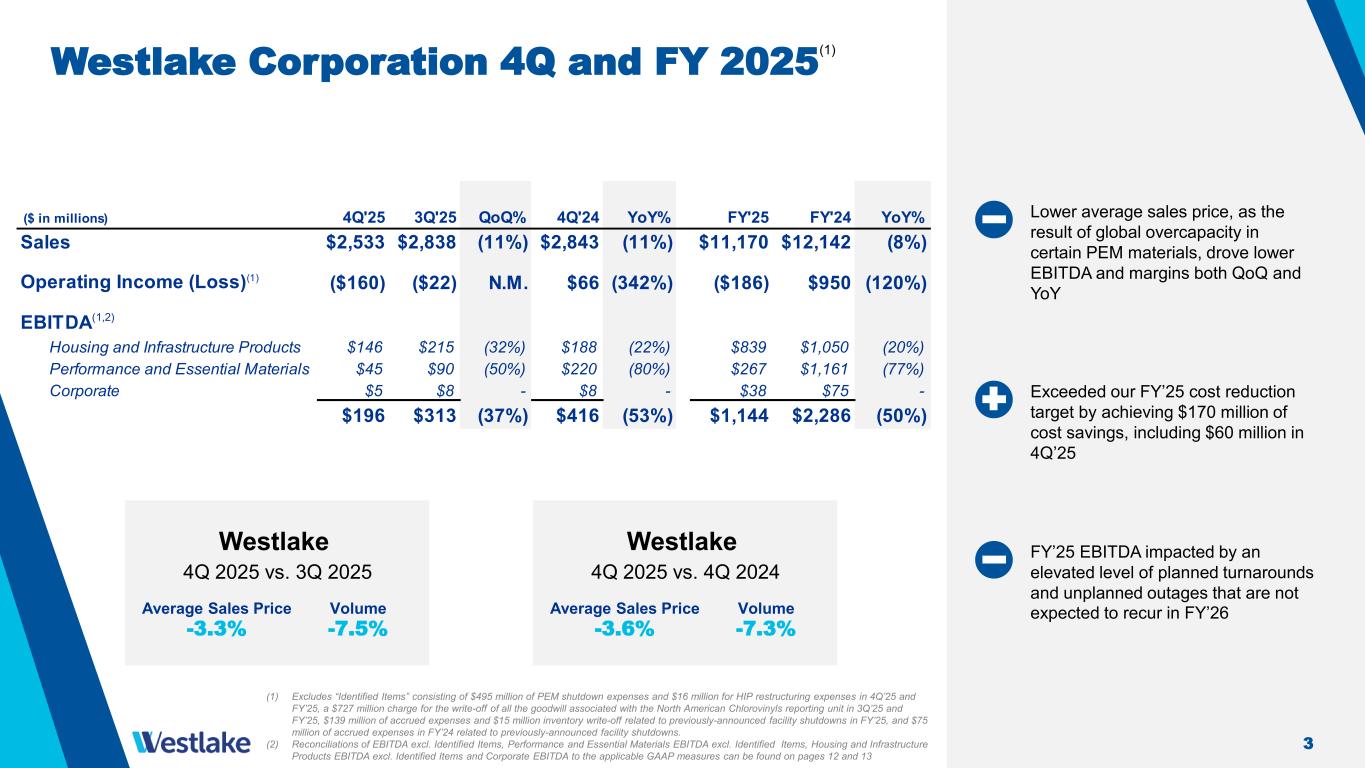 2 Fourth Quarter and Full Year 2025 Highlights Profitability Improvement Plan expected to deliver $600M EBITDA benefit in 2026 • Actions initiated in 2025 are expected to improve EBITDA by $600 million in 2026 • HIP sales and volumes benefitted from continued strong pipe and fittings demand from growing North America infrastructure spending • PEM’s 4Q’25 EBITDA performed well due to improved operational results, a gain on pension restructuring, and several smaller discrete items • Achieved $170 million of cost savings in FY’25, including $60 million in 4Q’25, meeting raised target for FY’25 and driving momentum into 2026 • Investment-grade credit rating with $2.9 billion of cash and securities $2.5B Net Sales 11% decrease QoQ $196M EBITDA(1,2) 37% decrease QoQ (2) $225M Net Cash Provided by Operating Activities (1) Reconciliation of EBITDA excl. Identified Item to Net Income, Income from Operations and Net Cash Provided by Operating Activities can be found on page 12 (2) Excludes “Identified Items” consisting of $495 million of PEM shutdown expenses and $16 million for HIP restructuring expenses in 4Q’25 and FY’25, a $727 million charge for the write-off of all the goodwill associated with the North American Chlorovinyls reporting unit and $139 million of accrued expenses and $15 million inventory write-off related to previously-announced facility shutdowns in FY’25, and $75 million of accrued expenses in FY’24 related to previously-announced facility shutdowns. $11.2B Net Sales 8% decrease YoY $1.1B EBITDA(1,2) 50% decrease YoY (2) $465M Net Cash Provided by Operating Activities 4Q 2025 Financial Results FY 2025 Financial Results