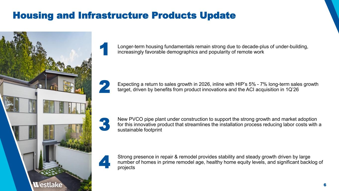 5 Housing and Infrastructure Products (“HIP”) Segment Performance(1) HIP Segment 4Q 2025 vs. 3Q 2025 Average Sales Price -0.6% Volume -16.9% HIP Segment 4Q 2025 vs. 4Q 2024 Average Sales Price -0.2% Volume -8.0% Slower North American residential construction demand drove the 8% YoY decline in sales and volume in 4Q’25 FY’25 EBITDA of $839 million met guidance and was driven by continued strong demand for pipe & fittings The breadth of HIP’s product offerings and its broad geographic reach are expected to drive FY’26 sales to $4.4 - $4.6 billion with an expected EBITDA margin of 19% - 21% (1) Excludes “Identified Items” consisting of $13 million accrued footprint optimization expenses and a $3 million loss on the sale of a compounding business in 4Q’25 and FY’25 (2) Reconciliations of HIP EBITDA excl. Identified Items to the applicable GAAP measure can be found on page 13 (3) HIP EBITDA margin is calculated by dividing HIP EBITDA excl. Identified Items by Total HIP Sales 4Q’25 and FY’25 EBITDA margin impacted by unfavorable sales mix shift and competitive market pressures in pipe & fittings 4Q'25 3Q'25 QoQ% 4Q'24 YoY% FY'25 FY'24 YoY% Housing Products Sales $767 $928 (17%) $818 (6%) $3,513 $3,644 (4%) Infrastructure Products Sales $134 $163 (18%) $163 (18%) $635 $673 (6%) Total HIP Sales $901 $1,091 (17%) $981 (8%) $4,148 $4,317 (4%) Operating Income(1) $82 $151 (46%) $129 (36%) $603 $807 (25%) EBITDA(1,2) $146 $215 (32%) $188 (22%) $839 $1,050 (20%) EBITDA Margin (1,3) 16% 20% - 19% - 20% 24% - ($ in millions)