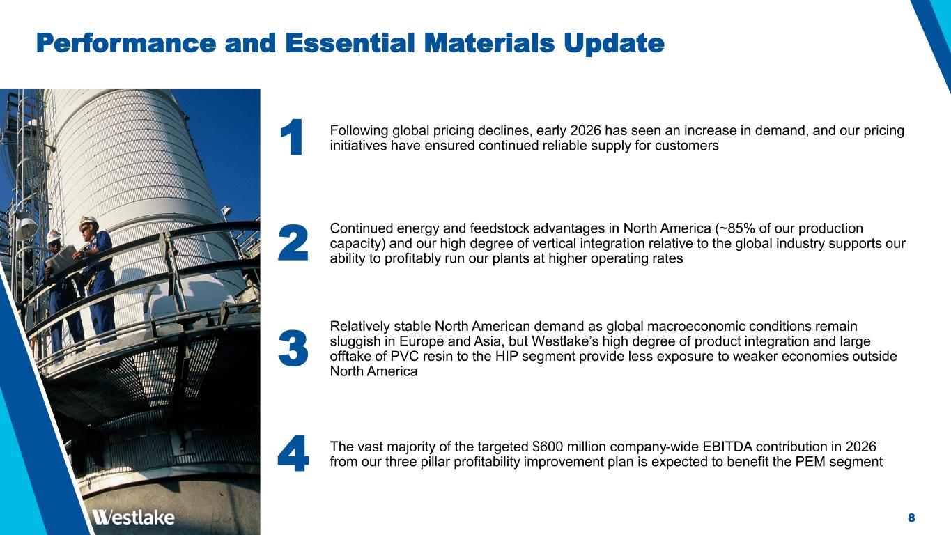7 PEM Segment 4Q 2025 vs. 3Q 2025 Average Sales Price -4.9% Volume -1.6% PEM Segment 4Q 2025 vs. 4Q 2024 Average Sales Price -5.4% Volume -6.9% Lower average sales price, both QoQ and YoY, driven by lower prices for PVC resin and polyethylene, partially offset by higher prices for caustic soda Higher YoY feedstock and energy costs contributed to the EBITDA margin decline in 4Q’25 and FY’25 (1) Excludes “Identified Items” consisting of $495 million of PEM shutdown expenses in 4Q’25 and FY’25, a $727 million charge for the write-off of all the goodwill associated with the North American Chlorovinyls reporting unit in 3Q’25 and FY’25, $139 million of accrued expenses and $15 million inventory write-off related to previously-announced facility shutdowns in FY’25, and $75 million of accrued expenses in FY’24 related to previously-announced facility shutdowns. (2) Reconciliations of PEM EBITDA excl. Identified Items to the applicable GAAP measure can be found on page 13 (3) PEM EBITDA margin is calculated by dividing PEM EBITDA excl. Identified Items by Total PEM Sales Performance and Essential Materials (“PEM”) Segment Performance(1) Actions initiated in 2025, including the shutdown of European Epoxy, North American Chlorovinyls, and Styrene facilities, are expected to contribute $600 million of company- wide EBITDA improvement in 2026 4Q'25 3Q'25 QoQ% 4Q'24 YoY% FY'25 FY'24 YoY% Performance Materials Sales $930 $1,010 (8%) $1,121 (17%) $4,018 $4,626 (13%) Essential Materials Sales $702 $737 (5%) $741 (5%) $3,004 $3,199 (6%) Total PEM Sales $1,632 $1,747 (7%) $1,862 (12%) $7,022 $7,825 (10%) Operating Income (Loss)(1) ($222) ($158) N.M. ($41) N.M. ($724) $204 (455%) EBITDA(1,2) $45 $90 (50%) $220 (80%) $267 $1,161 (77%) EBITDA Margin (1,3) 3% 5% - 12% - 4% 15% - ($ in millions)