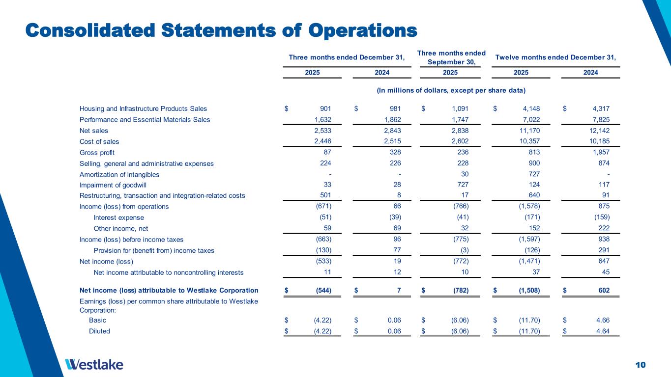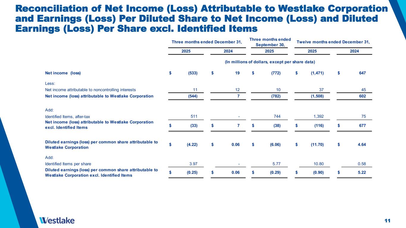 10 Consolidated Statements of Operations Housing and Infrastructure Products Sales $ 901 $ 981 $ 1,091 $ 4,148 $ 4,317 Performance and Essential Materials Sales 1,632 1,862 1,747 7,022 7,825 Net sales 2,533 2,843 2,838 11,170 12,142 Cost of sales Gross profit Selling, general and administrative expenses Amortization of intangibles Impairment of goodwill Restructuring, transaction and integration-related costs Income (loss) from operations Interest expense Other income, net Income (loss) before income taxes Provision for (benefit from) income taxes Net income (loss) Net income attributable to noncontrolling interests Net income (loss) attributable to Westlake Corporation $ (544) $ 7 $ (782) $ (1,508) $ 602 Earnings (loss) per common share attributable to Westlake Corporation: Basic $ (4.22) $ 0.06 $ (6.06) $ (11.70) $ 4.66 Diluted $ (4.22) $ 0.06 $ (6.06) $ (11.70) $ 4.64 12 37 45 10 11 (772) 77 (126) 291 17 (766) (41) 32 2024 2025 2024 (In millions of dollars, except per share data) (775) (3) (130) (51) (39) (171) (159) 19 (1,471) 647 (663) 96 (1,597) 938 59 69 152 222 (533) 501 8 640 91 (671) 66 (1,578) 875 33 28 727 124 117 - - 727 - 30 224 226 900 874 228 Three months ended December 31, Twelve months ended December 31, Three months ended September 30, 87 328 813 1,957 2025 2,602 236 2,446 2,515 10,357 10,185 2025