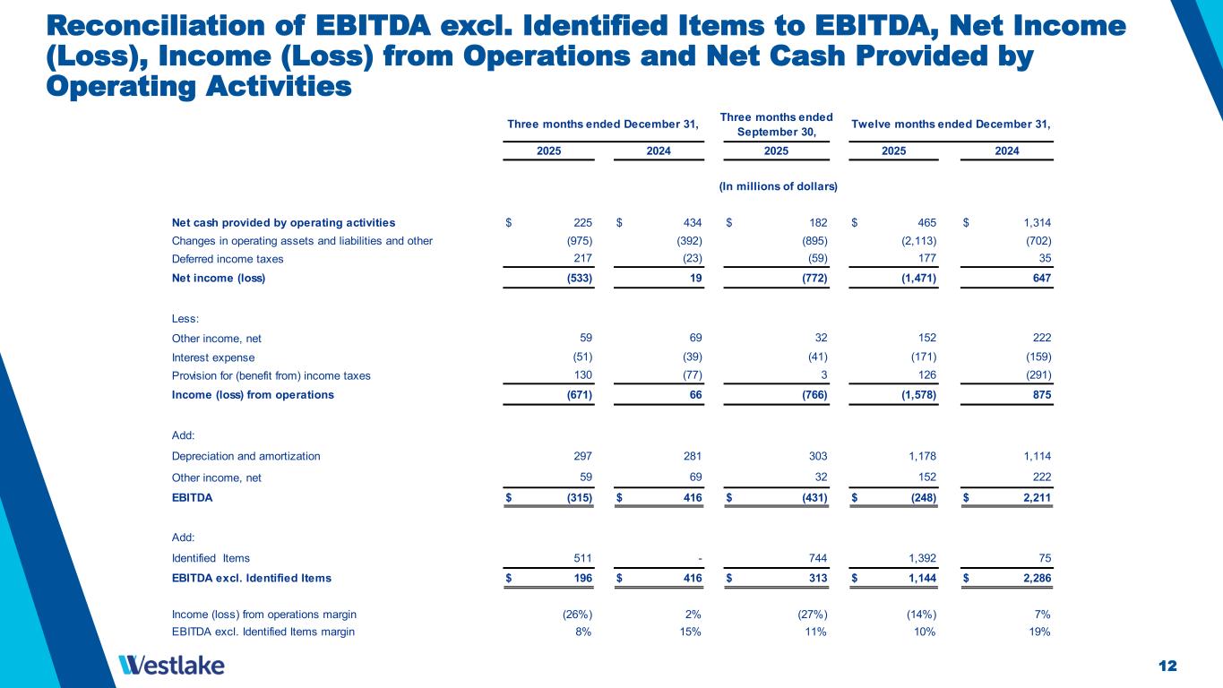 11 Reconciliation of Net Income (Loss) Attributable to Westlake Corporation and Earnings (Loss) Per Diluted Share to Net Income (Loss) and Diluted Earnings (Loss) Per Share excl. Identified Items Net income (loss) $ (533) $ 19 $ (772) $ (1,471) $ 647 Less: Net income attributable to noncontrolling interests Net income (loss) attributable to Westlake Corporation (544) 7 (782) (1,508) 602 Add: Identified Items, after-tax Net income (loss) attributable to Westlake Corporation excl. Identified Items $ (33) $ 7 $ (38) $ (116) $ 677 Diluted earnings (loss) per common share attributable to Westlake Corporation $ (4.22) $ 0.06 $ (6.06) $ (11.70) $ 4.64 Add: Identified Items per share Diluted earnings (loss) per common share attributable to Westlake Corporation excl. Identified Items $ (0.25) $ 0.06 $ (0.29) $ (0.90) $ 5.22 511 5.77 75 - 0.58 1,392 744 - 3.97 10.80 11 12 10 37 45 (In millions of dollars, except per share data) Three months ended December 31, Three months ended September 30, Twelve months ended December 31, 2025 2024 2025 2025 2024