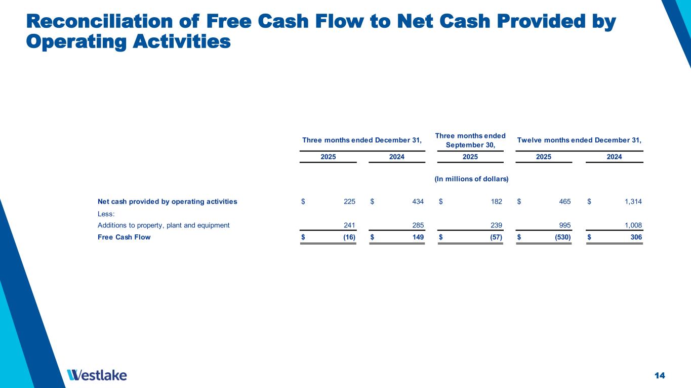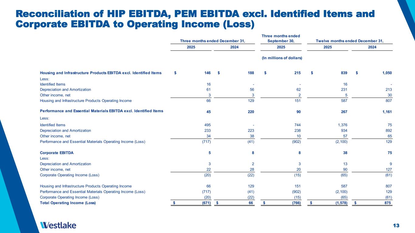13 Reconciliation of HIP EBITDA, PEM EBITDA excl. Identified Items and Corporate EBITDA to Operating Income (Loss) Three months ended December 31, Three months ended September 30, Twelve months ended December 31, 2025 2024 2025 2025 2024 Housing and Infrastructure Products EBITDA excl. Identified Items $ 146 $ 188 $ 215 $ 839 $ 1,050 Less: Identified Items 16 - - 16 - Depreciation and Amortization 61 56 62 231 213 Other income, net 3 3 2 5 30 Housing and Infrastructure Products Operating Income 66 129 151 587 807 Performance and Essential Materials EBITDA excl. Identified Items 45 220 90 267 1,161 Less: Identified Items 495 - 744 1,376 75 Depreciation and Amortization 233 223 238 934 892 Other income, net 34 38 10 57 65 Performance and Essential Materials Operating Income (Loss) (717) (41) (902) (2,100) 129 Corporate EBITDA 5 8 8 38 75 Less: Depreciation and Amortization 3 2 3 13 9 Other income, net 22 28 20 90 127 Corporate Operating Income (Loss) (20) (22) (15) (65) (61) Housing and Infrastructure Products Operating Income 66 129 151 587 807 Performance and Essential Materials Operating Income (Loss) (717) (41) (902) (2,100) 129 Corporate Operating Income (Loss) (20) (22) (15) (65) (61) Total Operating Income (Loss) (671)$ 66$ (766)$ (1,578)$ 875$  (In millions of dollars)