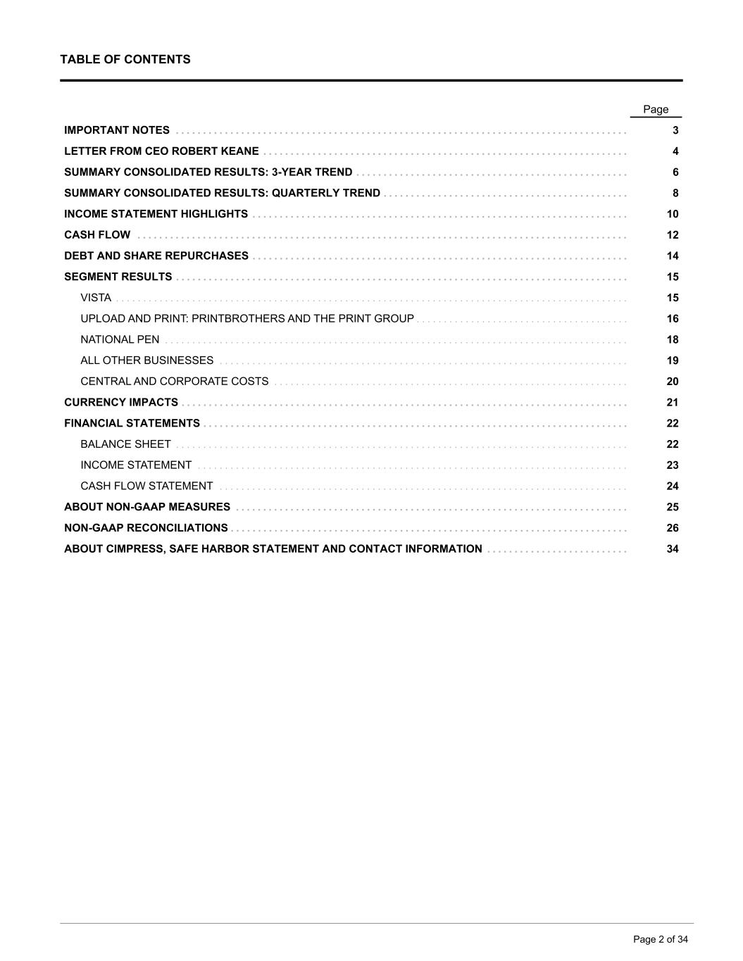TABLE OF CONTENTS Page IMPORTANT NOTES . . . . . . . . . . . . . . . . . . . . . . . . . . . . . . . . . . . . . . . . . . . . . . . . . . . . . . . . . . . . . . . . . . . . . . . . . . . . . . . . . . . 3 LETTER FROM CEO ROBERT KEANE . . . . . . . . . . . . . . . . . . . . . . . . . . . . . . . . . . . . . . . . . . . . . . . . . . . . . . . . . . . . . . . . . . . 4 SUMMARY CONSOLIDATED RESULTS: 3-YEAR TREND . . . . . . . . . . . . . . . . . . . . . . . . . . . . . . . . . . . . . . . . . . . . . . . . . . 6 SUMMARY CONSOLIDATED RESULTS: QUARTERLY TREND . . . . . . . . . . . . . . . . . . . . . . . . . . . . . . . . . . . . . . . . . . . . . 8 INCOME STATEMENT HIGHLIGHTS . . . . . . . . . . . . . . . . . . . . . . . . . . . . . . . . . . . . . . . . . . . . . . . . . . . . . . . . . . . . . . . . . . . . . 10 CASH FLOW . . . . . . . . . . . . . . . . . . . . . . . . . . . . . . . . . . . . . . . . . . . . . . . . . . . . . . . . . . . . . . . . . . . . . . . . . . . . . . . . . . . . . . . . . . 12 DEBT AND SHARE REPURCHASES . . . . . . . . . . . . . . . . . . . . . . . . . . . . . . . . . . . . . . . . . . . . . . . . . . . . . . . . . . . . . . . . . . . . . 14 SEGMENT RESULTS . . . . . . . . . . . . . . . . . . . . . . . . . . . . . . . . . . . . . . . . . . . . . . . . . . . . . . . . . . . . . . . . . . . . . . . . . . . . . . . . . . . 15 VISTA . . . . . . . . . . . . . . . . . . . . . . . . . . . . . . . . . . . . . . . . . . . . . . . . . . . . . . . . . . . . . . . . . . . . . . . . . . . . . . . . . . . . . . . . . . . . . . 15 UPLOAD AND PRINT: PRINTBROTHERS AND THE PRINT GROUP . . . . . . . . . . . . . . . . . . . . . . . . . . . . . . . . . . . . . . . 16 NATIONAL PEN . . . . . . . . . . . . . . . . . . . . . . . . . . . . . . . . . . . . . . . . . . . . . . . . . . . . . . . . . . . . . . . . . . . . . . . . . . . . . . . . . . . . . 18 ALL OTHER BUSINESSES . . . . . . . . . . . . . . . . . . . . . . . . . . . . . . . . . . . . . . . . . . . . . . . . . . . . . . . . . . . . . . . . . . . . . . . . . . . 19 CENTRAL AND CORPORATE COSTS . . . . . . . . . . . . . . . . . . . . . . . . . . . . . . . . . . . . . . . . . . . . . . . . . . . . . . . . . . . . . . . . . 20 CURRENCY IMPACTS . . . . . . . . . . . . . . . . . . . . . . . . . . . . . . . . . . . . . . . . . . . . . . . . . . . . . . . . . . . . . . . . . . . . . . . . . . . . . . . . . . 21 FINANCIAL STATEMENTS . . . . . . . . . . . . . . . . . . . . . . . . . . . . . . . . . . . . . . . . . . . . . . . . . . . . . . . . . . . . . . . . . . . . . . . . . . . . . . 22 BALANCE SHEET . . . . . . . . . . . . . . . . . . . . . . . . . . . . . . . . . . . . . . . . . . . . . . . . . . . . . . . . . . . . . . . . . . . . . . . . . . . . . . . . . . . 22 INCOME STATEMENT . . . . . . . . . . . . . . . . . . . . . . . . . . . . . . . . . . . . . . . . . . . . . . . . . . . . . . . . . . . . . . . . . . . . . . . . . . . . . . . 23 CASH FLOW STATEMENT . . . . . . . . . . . . . . . . . . . . . . . . . . . . . . . . . . . . . . . . . . . . . . . . . . . . . . . . . . . . . . . . . . . . . . . . . . . 24 ABOUT NON-GAAP MEASURES . . . . . . . . . . . . . . . . . . . . . . . . . . . . . . . . . . . . . . . . . . . . . . . . . . . . . . . . . . . . . . . . . . . . . . . . 25 NON-GAAP RECONCILIATIONS . . . . . . . . . . . . . . . . . . . . . . . . . . . . . . . . . . . . . . . . . . . . . . . . . . . . . . . . . . . . . . . . . . . . . . . . . 26 ABOUT CIMPRESS, SAFE HARBOR STATEMENT AND CONTACT INFORMATION . . . . . . . . . . . . . . . . . . . . . . . . . . 34 Page 2 of 34