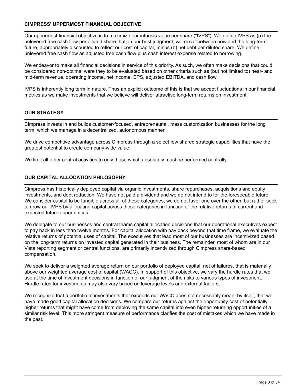 CIMPRESS' UPPERMOST FINANCIAL OBJECTIVE Our uppermost financial objective is to maximize our intrinsic value per share (“IVPS”). We define IVPS as (a) the unlevered free cash flow per diluted share that, in our best judgment, will occur between now and the long-term future, appropriately discounted to reflect our cost of capital, minus (b) net debt per diluted share. We define unlevered free cash flow as adjusted free cash flow plus cash interest expense related to borrowing. We endeavor to make all financial decisions in service of this priority. As such, we often make decisions that could be considered non-optimal were they to be evaluated based on other criteria such as (but not limited to) near- and mid-term revenue, operating income, net income, EPS, adjusted EBITDA, and cash flow. IVPS is inherently long term in nature. Thus an explicit outcome of this is that we accept fluctuations in our financial metrics as we make investments that we believe will deliver attractive long-term returns on investment. OUR STRATEGY Cimpress invests in and builds customer-focused, entrepreneurial, mass customization businesses for the long term, which we manage in a decentralized, autonomous manner. We drive competitive advantage across Cimpress through a select few shared strategic capabilities that have the greatest potential to create company-wide value. We limit all other central activities to only those which absolutely must be performed centrally. OUR CAPITAL ALLOCATION PHILOSOPHY Cimpress has historically deployed capital via organic investments, share repurchases, acquisitions and equity investments, and debt reduction. We have not paid a dividend and we do not intend to for the foreseeable future. We consider capital to be fungible across all of these categories; we do not favor one over the other, but rather seek to grow our IVPS by allocating capital across these categories in function of the relative returns of current and expected future opportunities. We delegate to our businesses and central teams capital allocation decisions that our operational executives expect to pay back in less than twelve months. For capital allocation with pay back beyond that time frame, we evaluate the relative returns of potential uses of capital. The executives that lead most of our businesses are incentivized based on the long-term returns on invested capital generated in their business. The remainder, most of whom are in our Vista reporting segment or central functions, are primarily incentivized through Cimpress share-based compensation. We seek to deliver a weighted average return on our portfolio of deployed capital, net of failures, that is materially above our weighted average cost of capital (WACC). In support of this objective, we vary the hurdle rates that we use at the time of investment decisions in function of our judgment of the risks to various types of investment. Hurdle rates for investments may also vary based on leverage levels and external factors. We recognize that a portfolio of investments that exceeds our WACC does not necessarily mean, by itself, that we have made good capital allocation decisions. We compare our returns against the opportunity cost of potentially higher returns that might have come from deploying the same capital into even higher-returning opportunities of a similar risk level. This more stringent measure of performance clarifies the cost of mistakes which we have made in the past. Page 3 of 34
