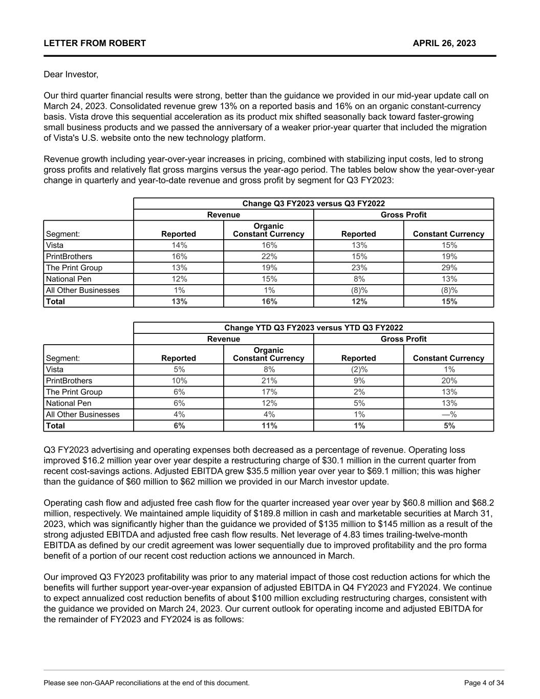 LETTER FROM ROBERT APRIL 26, 2023 Dear Investor, Our third quarter financial results were strong, better than the guidance we provided in our mid-year update call on March 24, 2023. Consolidated revenue grew 13% on a reported basis and 16% on an organic constant-currency basis. Vista drove this sequential acceleration as its product mix shifted seasonally back toward faster-growing small business products and we passed the anniversary of a weaker prior-year quarter that included the migration of Vista's U.S. website onto the new technology platform. Revenue growth including year-over-year increases in pricing, combined with stabilizing input costs, led to strong gross profits and relatively flat gross margins versus the year-ago period. The tables below show the year-over-year change in quarterly and year-to-date revenue and gross profit by segment for Q3 FY2023: Change Q3 FY2023 versus Q3 FY2022 Revenue Gross Profit Segment: Reported Organic Constant Currency Reported Constant Currency Vista 14% 16% 13% 15% PrintBrothers 16% 22% 15% 19% The Print Group 13% 19% 23% 29% National Pen 12% 15% 8% 13% All Other Businesses 1% 1% (8)% (8)% Total 13% 16% 12% 15% Change YTD Q3 FY2023 versus YTD Q3 FY2022 Revenue Gross Profit Segment: Reported Organic Constant Currency Reported Constant Currency Vista 5% 8% (2)% 1% PrintBrothers 10% 21% 9% 20% The Print Group 6% 17% 2% 13% National Pen 6% 12% 5% 13% All Other Businesses 4% 4% 1% —% Total 6% 11% 1% 5% Q3 FY2023 advertising and operating expenses both decreased as a percentage of revenue. Operating loss improved $16.2 million year over year despite a restructuring charge of $30.1 million in the current quarter from recent cost-savings actions. Adjusted EBITDA grew $35.5 million year over year to $69.1 million; this was higher than the guidance of $60 million to $62 million we provided in our March investor update. Operating cash flow and adjusted free cash flow for the quarter increased year over year by $60.8 million and $68.2 million, respectively. We maintained ample liquidity of $189.8 million in cash and marketable securities at March 31, 2023, which was significantly higher than the guidance we provided of $135 million to $145 million as a result of the strong adjusted EBITDA and adjusted free cash flow results. Net leverage of 4.83 times trailing-twelve-month EBITDA as defined by our credit agreement was lower sequentially due to improved profitability and the pro forma benefit of a portion of our recent cost reduction actions we announced in March. Our improved Q3 FY2023 profitability was prior to any material impact of those cost reduction actions for which the benefits will further support year-over-year expansion of adjusted EBITDA in Q4 FY2023 and FY2024. We continue to expect annualized cost reduction benefits of about $100 million excluding restructuring charges, consistent with the guidance we provided on March 24, 2023. Our current outlook for operating income and adjusted EBITDA for the remainder of FY2023 and FY2024 is as follows: Please see non-GAAP reconciliations at the end of this document. Page 4 of 34