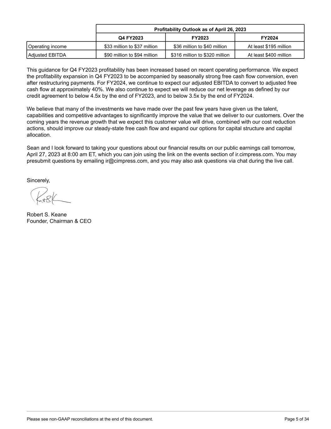 Profitability Outlook as of April 26, 2023 Q4 FY2023 FY2023 FY2024 Operating income $33 million to $37 million $36 million to $40 million At least $195 million Adjusted EBITDA $90 million to $94 million $316 million to $320 million At least $400 million This guidance for Q4 FY2023 profitability has been increased based on recent operating performance. We expect the profitability expansion in Q4 FY2023 to be accompanied by seasonally strong free cash flow conversion, even after restructuring payments. For FY2024, we continue to expect our adjusted EBITDA to convert to adjusted free cash flow at approximately 40%. We also continue to expect we will reduce our net leverage as defined by our credit agreement to below 4.5x by the end of FY2023, and to below 3.5x by the end of FY2024. We believe that many of the investments we have made over the past few years have given us the talent, capabilities and competitive advantages to significantly improve the value that we deliver to our customers. Over the coming years the revenue growth that we expect this customer value will drive, combined with our cost reduction actions, should improve our steady-state free cash flow and expand our options for capital structure and capital allocation. Sean and I look forward to taking your questions about our financial results on our public earnings call tomorrow, April 27, 2023 at 8:00 am ET, which you can join using the link on the events section of ir.cimpress.com. You may presubmit questions by emailing ir@cimpress.com, and you may also ask questions via chat during the live call. Sincerely, Robert S. Keane Founder, Chairman & CEO Please see non-GAAP reconciliations at the end of this document. Page 5 of 34