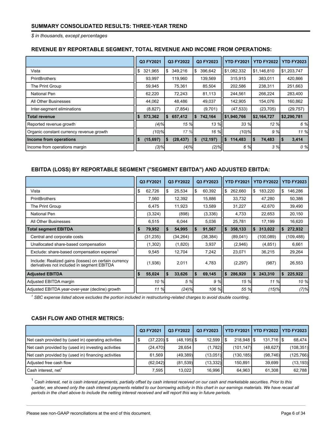 SUMMARY CONSOLIDATED RESULTS: THREE-YEAR TREND $ in thousands, except percentages REVENUE BY REPORTABLE SEGMENT, TOTAL REVENUE AND INCOME FROM OPERATIONS: Q3 FY2021 Q3 FY2022 Q3 FY2023 YTD FY2021 YTD FY2022 YTD FY2023 Vista $ 321,965 $ 349,216 $ 396,642 $ 1,082,332 $ 1,146,810 $ 1,203,747 PrintBrothers 93,997 119,960 139,569 315,915 383,011 420,866 The Print Group 59,945 75,361 85,504 202,586 238,311 251,663 National Pen 62,220 72,243 81,113 244,561 266,224 283,400 All Other Businesses 44,062 48,486 49,037 142,905 154,076 160,862 Inter-segment eliminations (8,827) (7,854) (9,701) (47,533) (23,705) (29,757) Total revenue $ 573,362 $ 657,412 $ 742,164 $ 1,940,766 $ 2,164,727 $ 2,290,781 Reported revenue growth (4) % 15 % 13 % 33 % 12 % 6 % Organic constant currency revenue growth (10) % 17 % 16 % (10) % 9 % 11 % Income from operations $ (15,697) $ (28,437) $ (12,197) $ 114,483 $ 74,483 $ 3,414 Income from operations margin (3) % (4) % (2) % 6 % 3 % 0 % EBITDA (LOSS) BY REPORTABLE SEGMENT ("SEGMENT EBITDA") AND ADJUSTED EBITDA: Q3 FY2021 Q3 FY2022 Q3 FY2023 YTD FY2021 YTD FY2022 YTD FY2023 Vista $ 62,726 $ 25,534 $ 60,392 $ 262,660 $ 183,220 $ 146,286 PrintBrothers 7,560 12,392 15,886 33,732 47,280 50,386 The Print Group 6,475 11,923 13,589 31,227 42,670 39,490 National Pen (3,324) (898) (3,336) 4,733 22,653 20,150 All Other Businesses 6,515 6,044 5,036 25,781 17,199 16,620 Total segment EBITDA $ 79,952 $ 54,995 $ 91,567 $ 358,133 $ 313,022 $ 272,932 Central and corporate costs (31,235) (34,264) (38,384) (89,041) (100,089) (109,488) Unallocated share-based compensation (1,302) (1,820) 3,937 (2,946) (4,851) 6,661 Exclude: share-based compensation expense1 9,545 12,704 7,242 23,071 36,215 29,264 Include: Realized gains (losses) on certain currency derivatives not included in segment EBITDA (1,936) 2,011 4,783 (2,297) (987) 26,553 Adjusted EBITDA $ 55,024 $ 33,626 $ 69,145 $ 286,920 $ 243,310 $ 225,922 Adjusted EBITDA margin 10 % 5 % 9 % 15 % 11 % 10 % Adjusted EBITDA year-over-year (decline) growth 11 % (24) % 106 % 55 % (15) % (7) % 1 SBC expense listed above excludes the portion included in restructuring-related charges to avoid double counting. CASH FLOW AND OTHER METRICS: Q3 FY2021 Q3 FY2022 Q3 FY2023 YTD FY2021 YTD FY2022 YTD FY2023 Net cash provided by (used in) operating activities $ (37,220) $ (48,195) $ 12,599 $ 218,948 $ 131,716 $ 68,474 Net cash provided by (used in) investing activities (24,470) 28,654 (1,782) (101,147) (48,627) (108,351) Net cash provided by (used in) financing activities 61,569 (49,389) (13,051) (130,185) (98,746) (125,766) Adjusted free cash flow (62,042) (81,539) (13,332) 150,891 39,699 (13,193) Cash interest, net1 7,595 13,022 16,996 64,963 61,308 62,788 1 Cash interest, net is cash interest payments, partially offset by cash interest received on our cash and marketable securities. Prior to this quarter, we showed only the cash interest payments related to our borrowing activity in this chart in our earnings materials. We have recast all periods in the chart above to include the netting interest received and will report this way in future periods. Please see non-GAAP reconciliations at the end of this document. Page 6 of 34