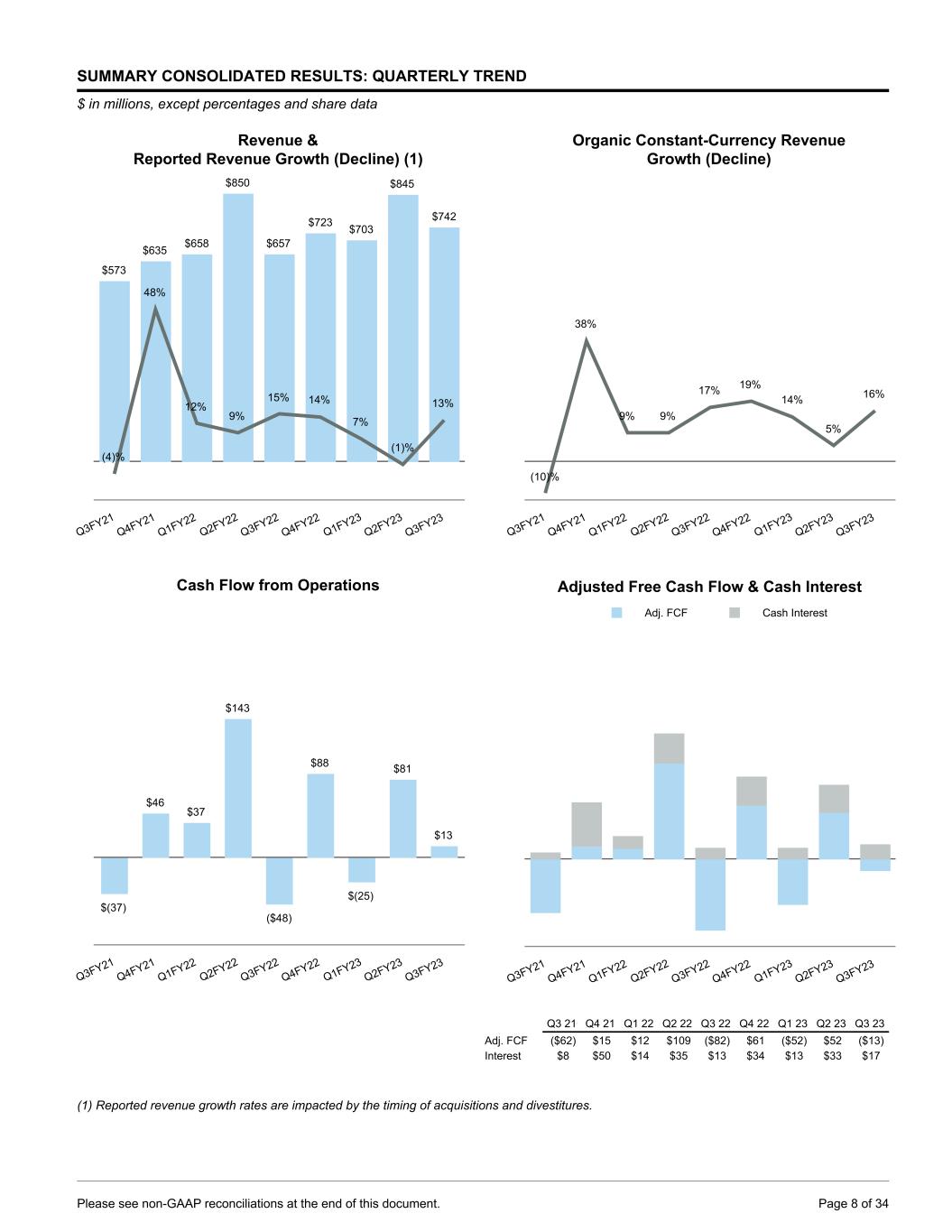 SUMMARY CONSOLIDATED RESULTS: QUARTERLY TREND $ in millions, except percentages and share data Revenue & Reported Revenue Growth (Decline) (1) $573 $635 $658 $850 $657 $723 $703 $845 $742 (4)% 48% 12% 9% 15% 14% 7% (1)% 13% Q3FY21 Q4FY21 Q1FY22 Q2FY22 Q3FY22 Q4FY22 Q1FY23 Q2FY23 Q3FY23 Cash Flow from Operations $(37) $46 $37 $143 ($48) $88 $(25) $81 $13 Q3FY21 Q4FY21 Q1FY22 Q2FY22 Q3FY22 Q4FY22 Q1FY23 Q2FY23 Q3FY23 Organic Constant-Currency Revenue Growth (Decline) (10)% 38% 9% 9% 17% 19% 14% 5% 16% Q3FY21 Q4FY21 Q1FY22 Q2FY22 Q3FY22 Q4FY22 Q1FY23 Q2FY23 Q3FY23 Adjusted Free Cash Flow & Cash Interest Adj. FCF Cash Interest Q3FY21 Q4FY21 Q1FY22 Q2FY22 Q3FY22 Q4FY22 Q1FY23 Q2FY23 Q3FY23 Q3 21 Q4 21 Q1 22 Q2 22 Q3 22 Q4 22 Q1 23 Q2 23 Q3 23 Adj. FCF ($62) $15 $12 $109 ($82) $61 ($52) $52 ($13) Interest $8 $50 $14 $35 $13 $34 $13 $33 $17 (1) Reported revenue growth rates are impacted by the timing of acquisitions and divestitures. Please see non-GAAP reconciliations at the end of this document. Page 8 of 34